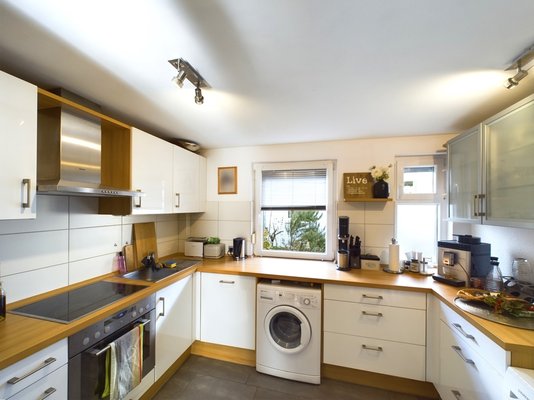 In der Küche findet sich ein moderner Fliesenspiegel und strapazierfähige Arbeitsflächen, die für nachhaltigen Komfort sorgen.