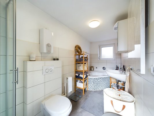 Das Badezimmer ist mit modernen Sanitärelementen ausgestattet, verfügt über 2 Fenster und eine geräumige Dusche sowie eine Badewanne und präsentiert sich in einem zeitlosen Design mit pflegeleichten Fliesen.