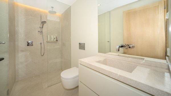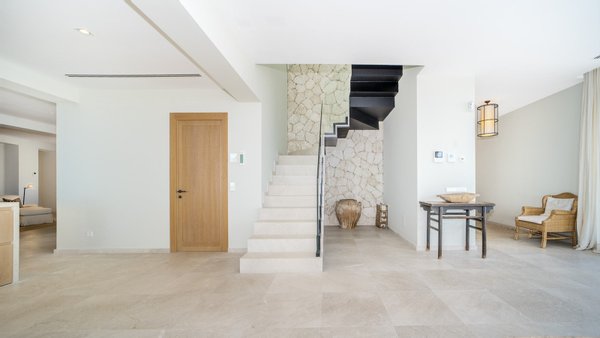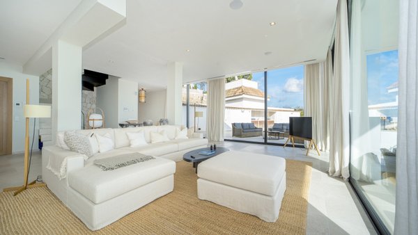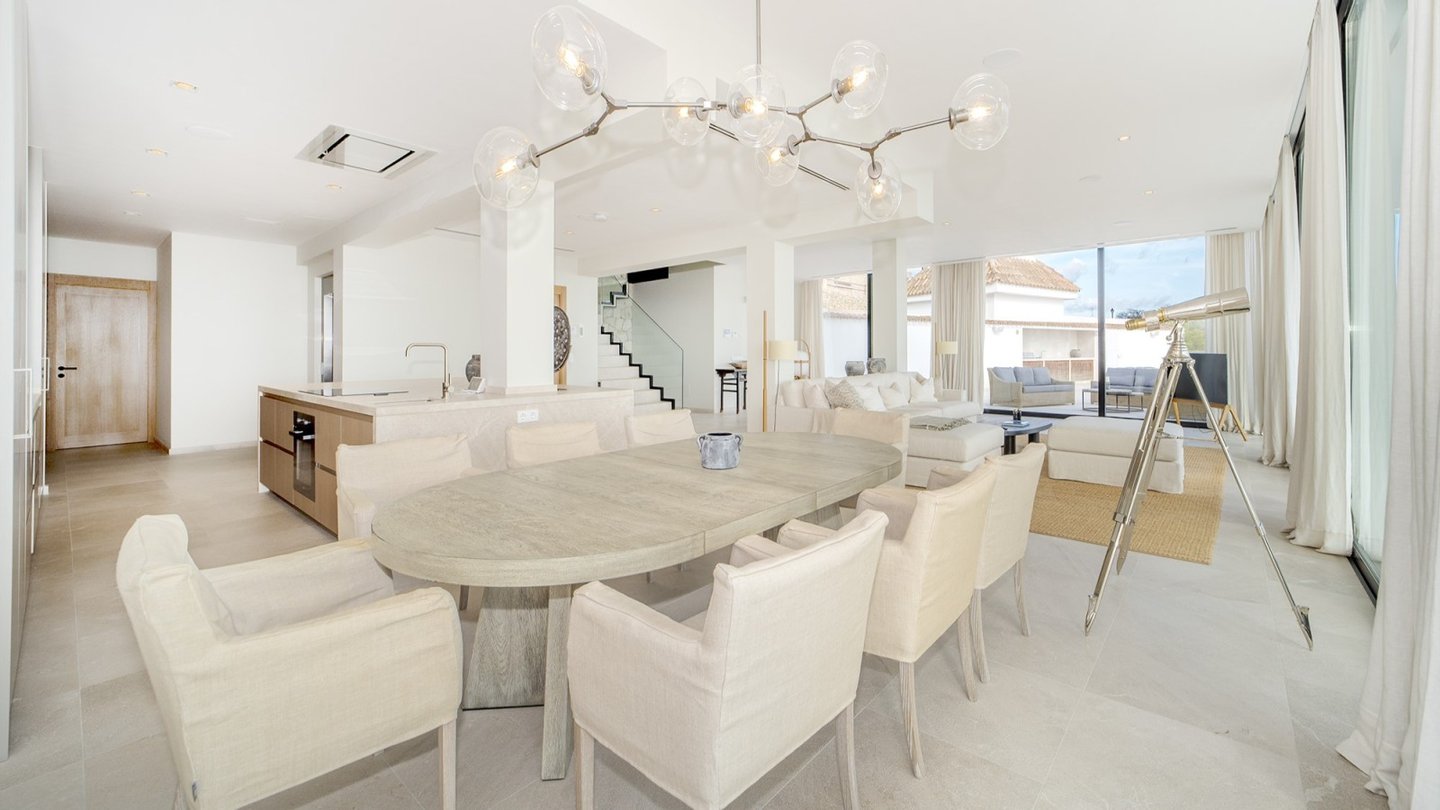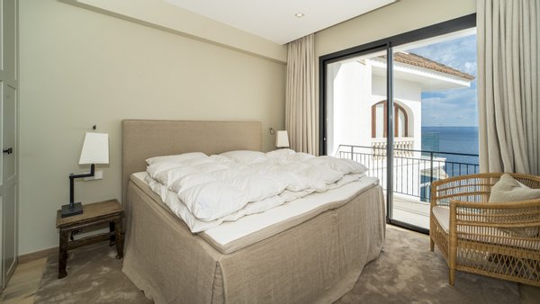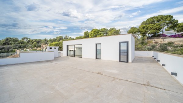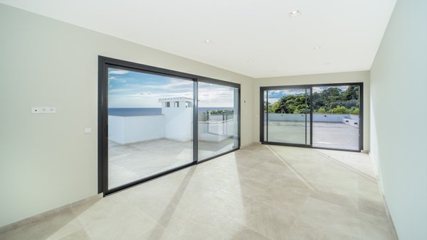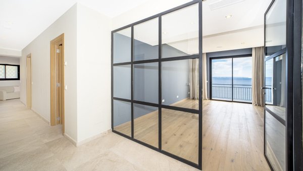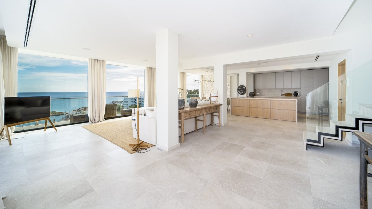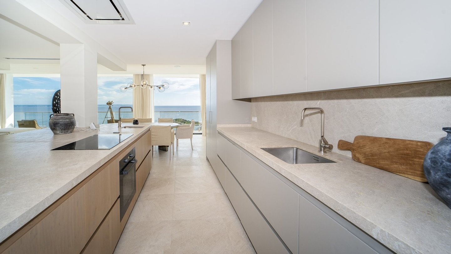 Dieses moderne und stilvolle Penthouse wurde im Jahr 2024 renoviert und verfügt über eine bebaute Fläche von ca. 351 m2. Über den Eingangsbereich gelangen Sie in das helle Wohn-Esszimmer mit deckenhohen Schiebetüren. Von dort aus haben Sie Zugang zur Terrasse mit spektakulärem Meerblick. Lassen Sie sich von der entspannten Atmosphäre der Chillout-Lounge verzaubern! Die Sommerküche mit Grillbereich ist ideal für gesellige Abende mit Familie und Freunden - hier können Sie leckere Mahlzeiten zubereiten. Die voll ausgestattete Einbauküche verfügt über die besten Elektrogeräte sowie einen Hauswirtschaftsraum mit Weinkühler. Auf dieser Etage gibt es außerdem ein Gäste-WC und einen Abstellraum. Über einen Flur gelangen Sie zu den vier Schlafzimmern mit Einbauschränken und vier Bädern, zwei davon en suite. Die Schlafzimmer sind durch einen gemeinsamen Balkon mit traumhaftem Meerblick verbunden. Das Highlight ist die ca. 165 m2 große, private Dachterrasse mit einem separaten Raum zur freien Nutzung. Beide Etagen sind per Lift oder Treppe zugänglich. Zur Ausstattung der Luxusimmobilie gehören: Klimaanlage, Fußbodenheizung, Naturstein- und Laminatböden, doppelt verglaste Fenster, SAT-TV, Gegensprechanlage sowie ein Tiefgaragenplatz mit elektrischem Garagentor. Das Gebäude des aussergewöhnlichen Penthouses liegt am Hang zwischen zwei Straßen. Von der oberen Straße gelangt man über ein paar Stufen direkt zur Immobilie. Von der unteren Straße bzw. von der Tiefgarage benutzt man den Lift, der direkt ins Penthouse führt.