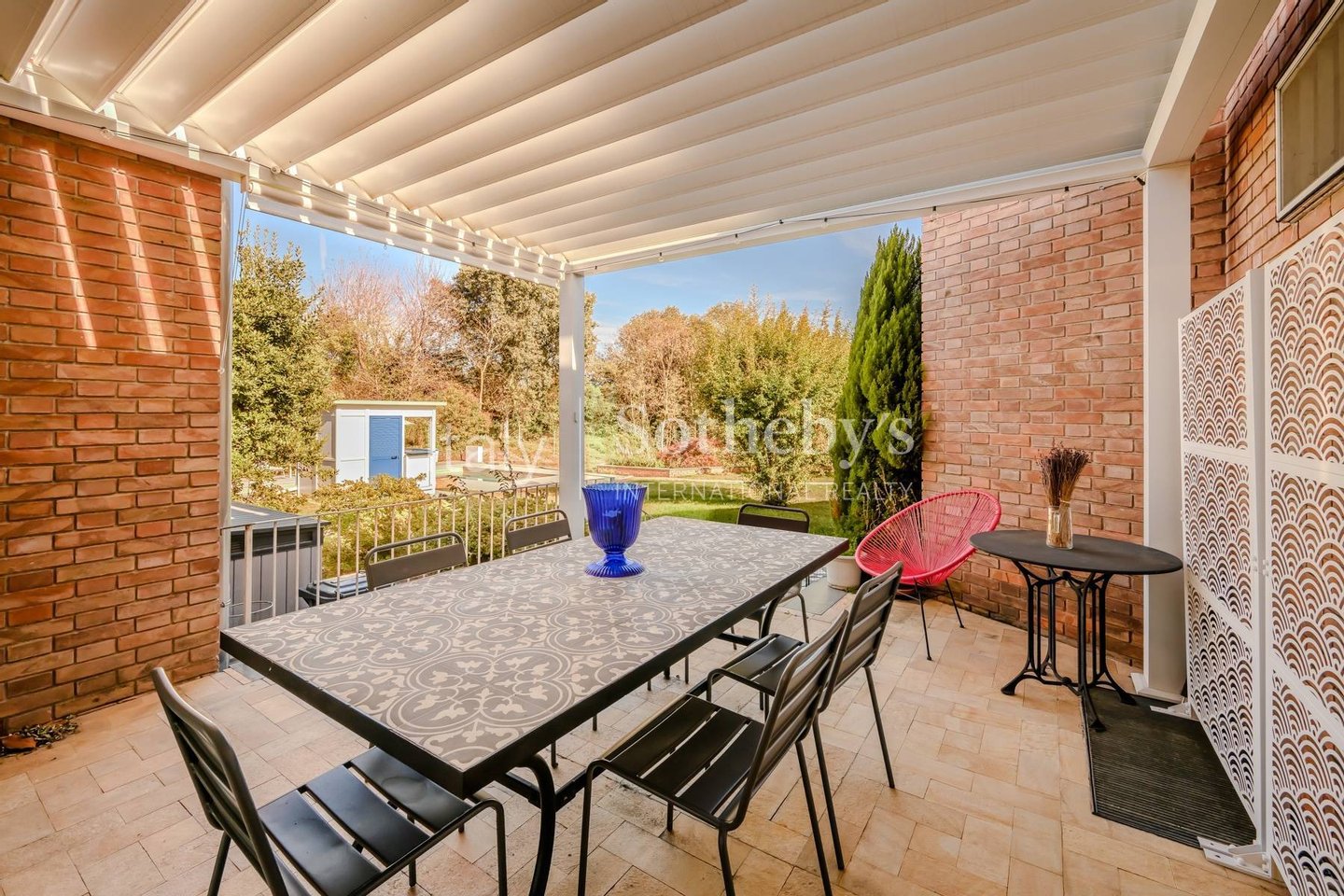 Im Außenbereich umgibt ein großer privater Garten mit Swimmingpool die Villa und bietet Privatsphäre sowie ideale Bereiche zum Entspannen oder zum Empfangen von Freunden und Familie.