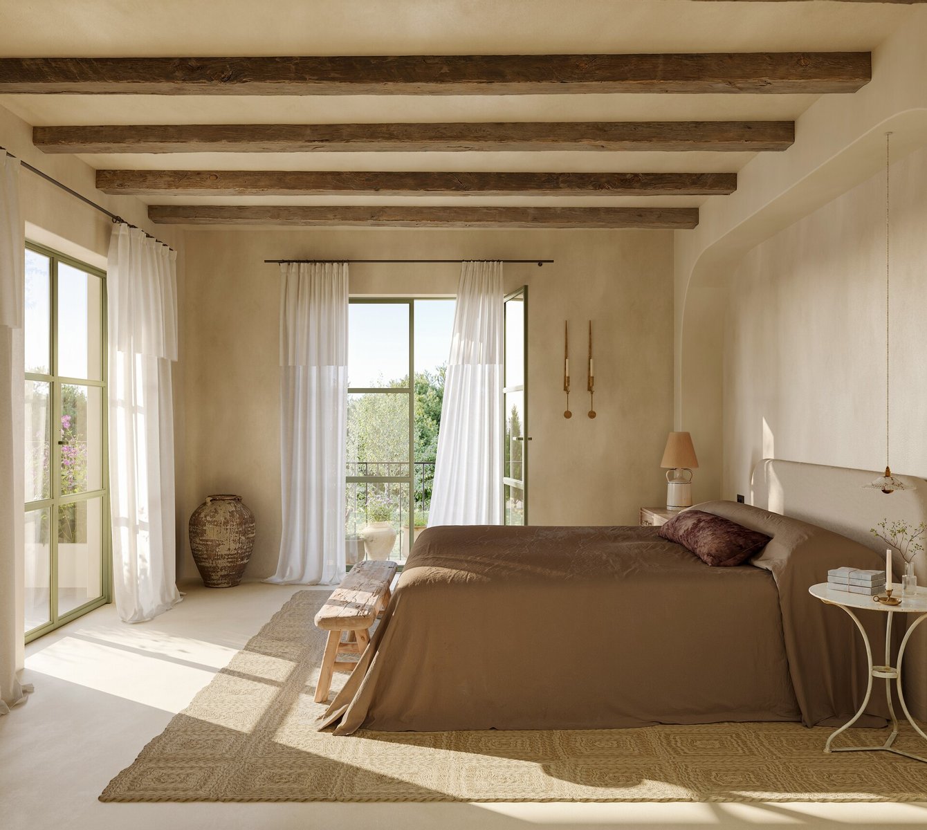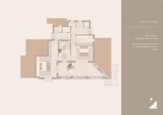 Im Obergeschoss befindet sich der Ruhebereich mit zwei Schlafzimmern, jeweils mit Ankleidezimmer und eigenem Bad. Beide haben Zugang zur Terrasse mit Blick auf den Garten.