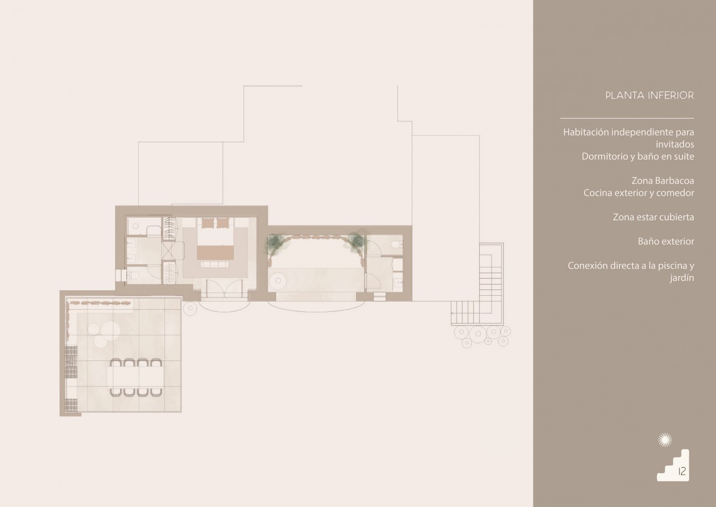 Im Untergeschoss gibt es ein separates Gästezimmer mit eigenem Bad, einen Grillbereich mit Außenküche und ein Esszimmer. Diese Etage hat direkten Zugang zum Garten.