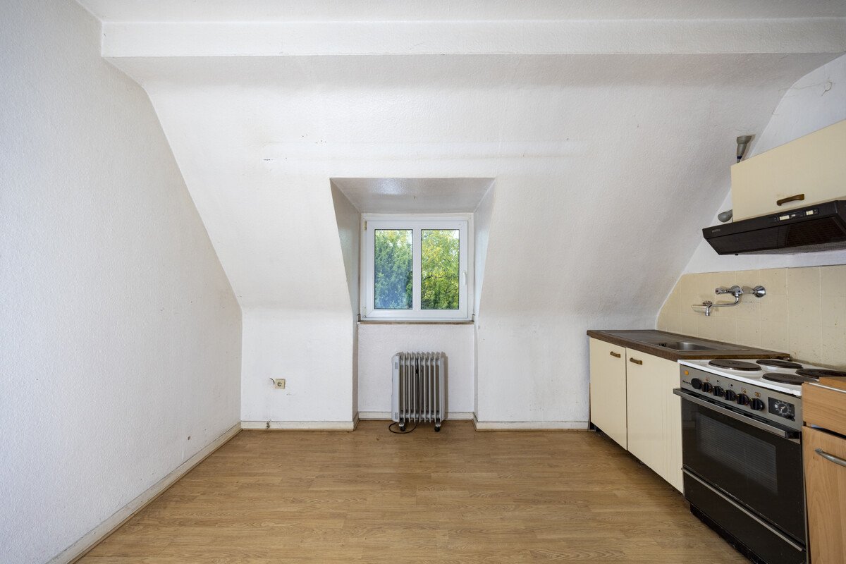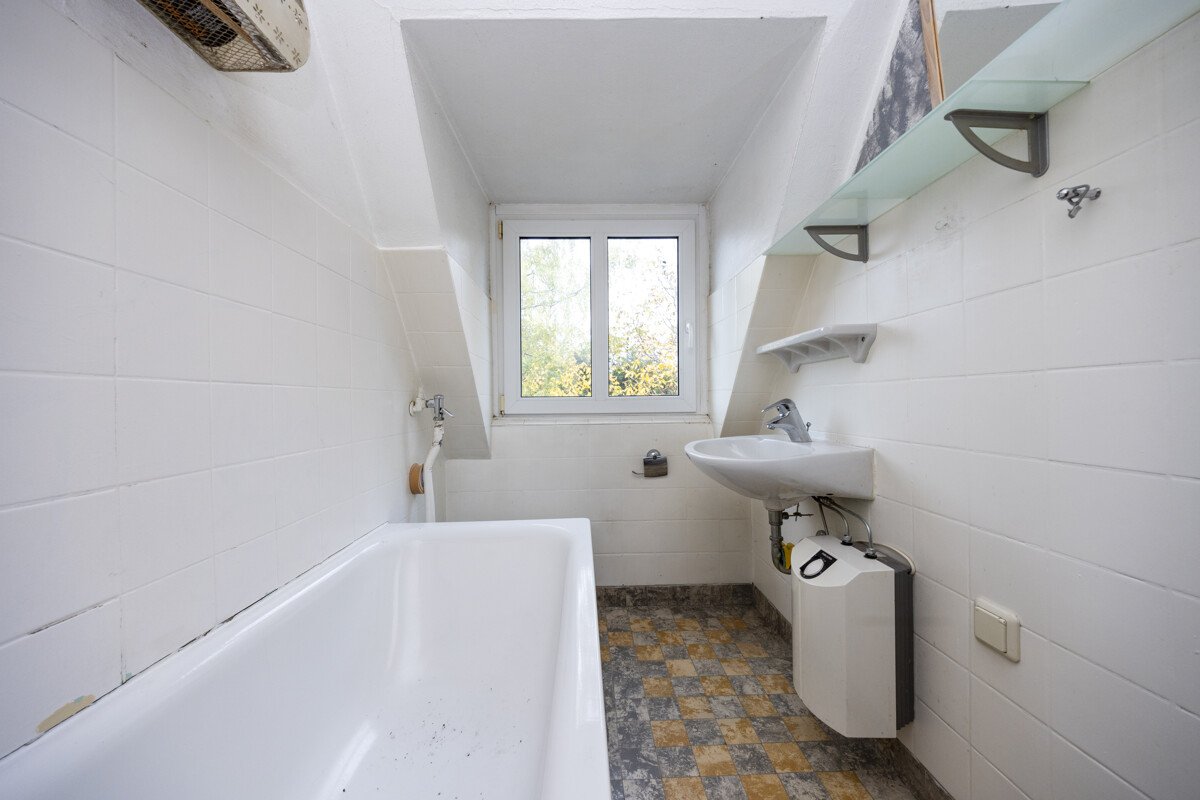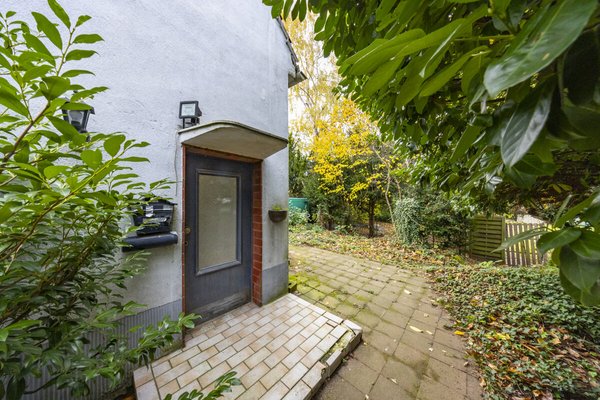 Die derzeitige Wohnfläche von rund 95 m² verteilt sich auf insgesamt vier Zimmer, zwei Wohnküchen sowie zwei Tageslichtbäder. Von der Küche im Erdgeschoss aus gelangen Sie direkt auf die Terrasse, die einen schönen Blick in den tiefen Garten bietet. Dieser ist durch seinen alten Baumbestand besonders charmant und natürlich bewachsen.