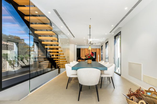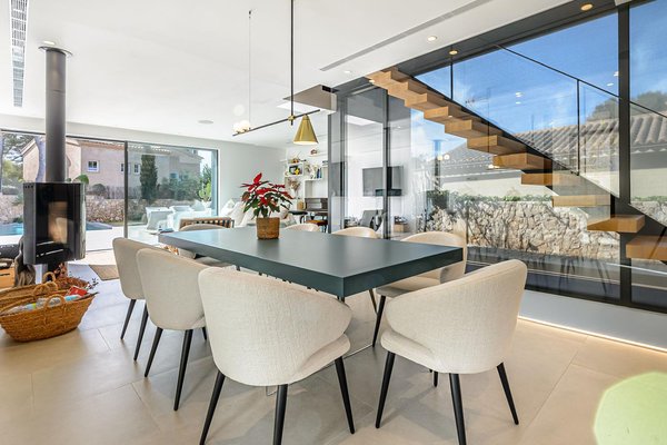 In einer der begehrtesten Wohnlagen Mallorcas präsentiert sich diese dreistöckige Designervilla als gelungene Verbindung aus modernem Design und hochwertigen mediterranen Materialien. Dank ihrer Südostausrichtung sind die Wohnbereiche das ganze Jahr über von natürlichem Licht durchflutet und vermitteln eine warme, einladende Atmosphäre.