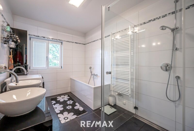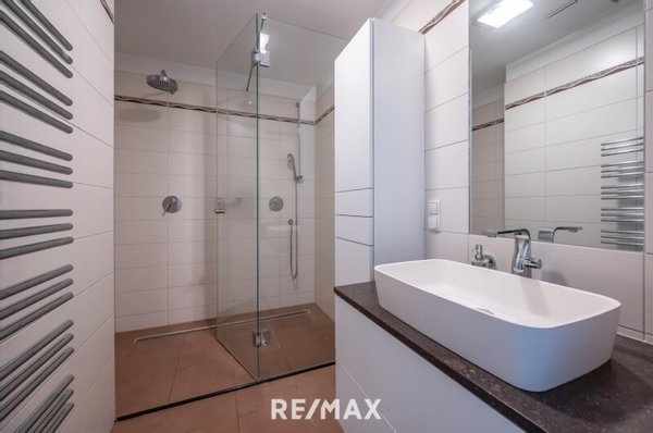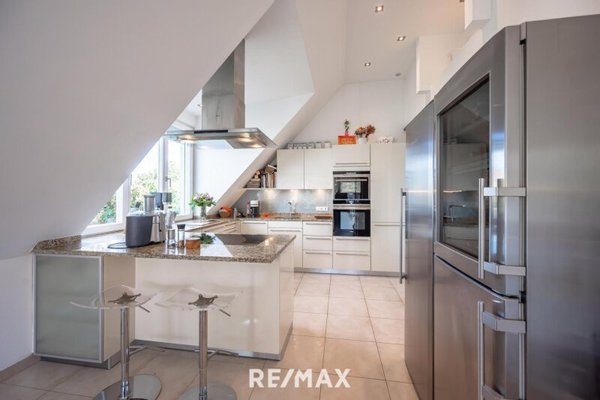 Das Obergeschoss besticht durch einen lichtdurchfluteten Wohnsalon mit offenem Kamin, eine offen gestaltete Designküche mit Essbereich sowie zusätzliche Lagermöglichkeiten. Das absolute Highlight: Die oberste Dachterrasse mit unverbaubarem Wien-Blick und einem Pool mit Edelstahlbecken und Gegenstromanlage – exklusiver lässt sich Entspannung kaum inszenieren.