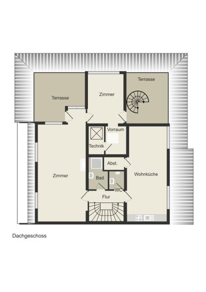 Das Penthouse erstreckt sich über zwei Ebenen eines sehr gepflegten Mehrparteienhauses. Die Raumaufteilung ist durchdacht und großzügig – mit fließenden Übergängen zwischen Wohnen, Arbeiten und Entspannen.