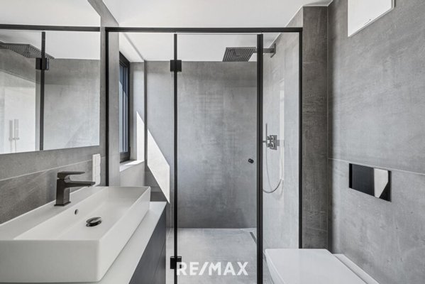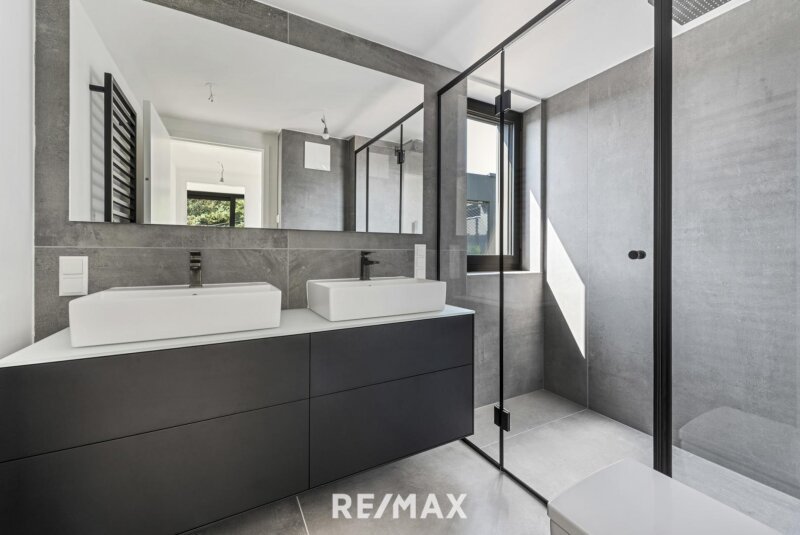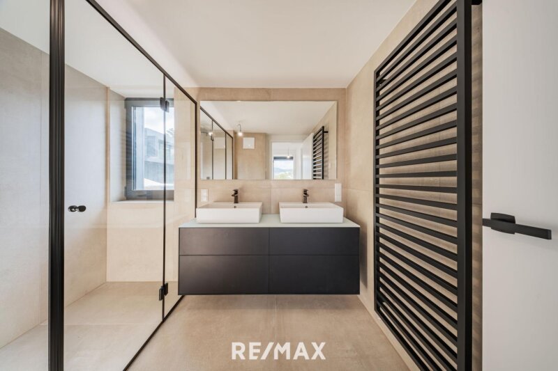 Obergeschoß: 2 Schlafzimmer, Bad mit Doppelwaschbecken, Dusche und WC, 7 m² Balkon