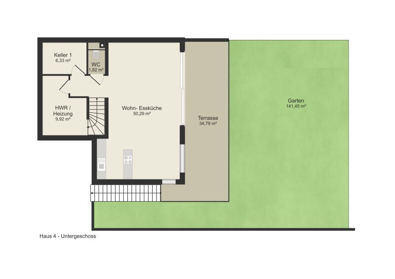 Im Untergeschoss bildet der offene Wohn- und Essbereich mit moderner Küche das Herzstück des Hauses – mit direktem Zugang zur Terrasse und dem anschließenden, begrünten Garten, der zu jeder Tageszeit zum Verweilen einlädt. Zwei ruhige Schlafzimmer sowie ein stilvolles Duschbad mit WC befinden sich im Erdgeschoss – ideal für Gäste, Kinder oder Homeoffice.