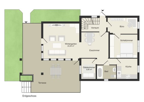 Die Ausstattung inkludiert moderne Annehmlichkeiten und bietet dennoch den Vorteil, sich individuell entfalten zu können. Die weitläufigen Terrassen bieten einen grandiosen Blick ins Grüne und die Möglichkeit, entspannte Stunden im Freien zu verbringen. Ein gepflegter Garten mit vielfältigen Gestaltungsmöglichkeiten lädt dazu ein, die warme Jahreszeit nach eigenen Vorstellungen zu genießen.