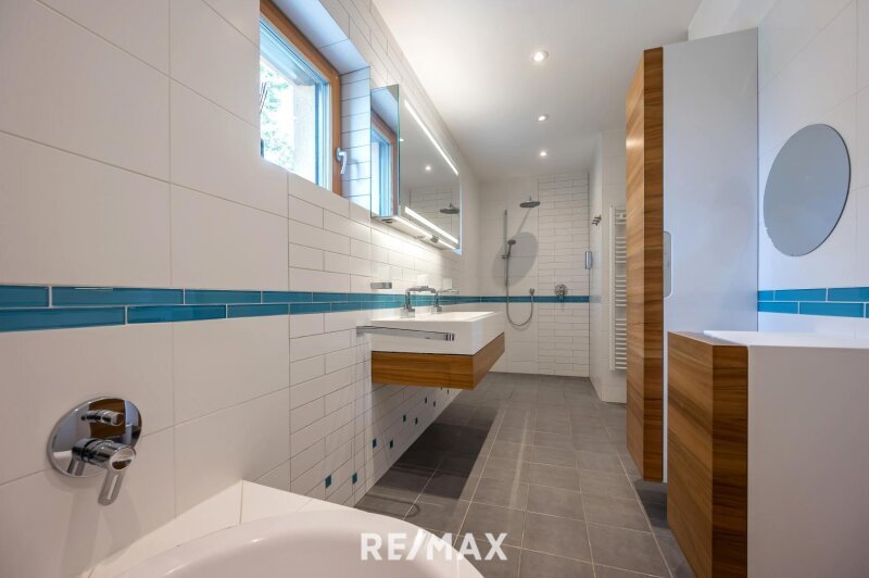 oObergeschoß: vier Schlafzimmer, eigener Schrankraum mit Wäschewurfschacht, Badezimmer mit Wanne, Dusche und Doppelwaschtisch (ca. 10 m²), separates WC.