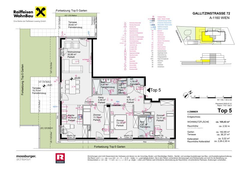 Diese attraktive Gartenwohnung besticht mit einer Wohnfläche von 105,43 m² sowie einer Terrasse von 36,37 m² und einem Garten von 182,89 m², die zum Entspannen einladen.