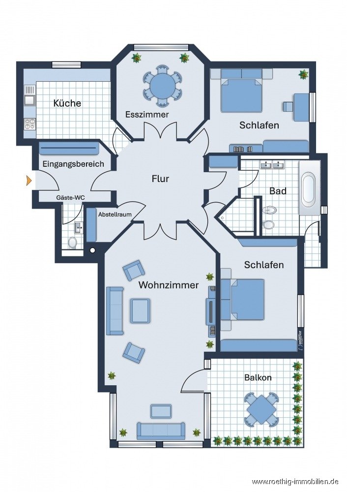 Die zentrale Diele verbindet geschickt alle weiteren Räume und führt direkt in den hellen Wohnbereich, dessen harmonischer Grundriss sofort ein Gefühl von Weite vermittelt.