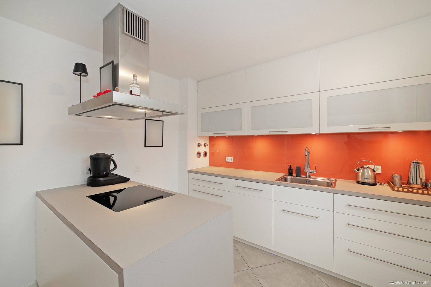 Die hochwertige Küche ist mit einem Ofen, Induktionsherd, Spülmaschine, Kühlschrank und einer Kochinsel versehen. Ein Fenster sorgt für Helligkeit und zusätzliche Belüftung. Angrenzend befindet sich das separate Esszimmer, welches sich lichtdurchflutet präsentiert und den idealen Ort für gesellige Stunden bietet.