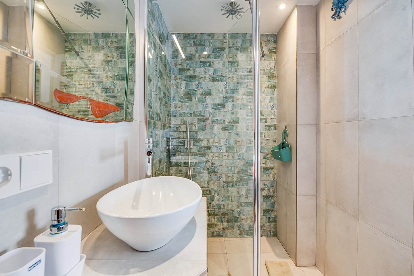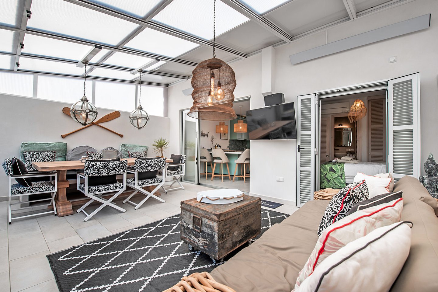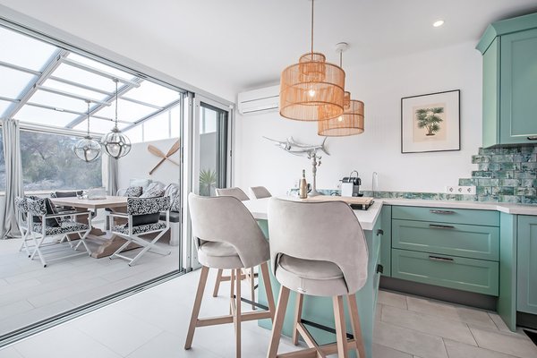 Das Haus ist im karibischen Stil gestaltet und verfügt über eine konstruierte Fläche von etwa 83 qm. Es bietet das gesamte Jahr über einen gemütlichen Rückzugsort. Der offene Wohnbereich mit integrierter Küche, ein einladender Wintergarten, zwei Schlafzimmer mit jeweils eigenem Bad en Suite und eine Garage sorgen für Komfort und Luxus. Geschmackvolle Einrichtung und hochwertige Ausstattung machen diesen Ort zur perfekten Erholungsoase. Im Außenbereich erwarten Sie ein entspannender Chill-Out-Bereich, eine Außenküche sowie ein beheizbarer Jacuzzi/Swim Spa mit Gegenstromanlage. Besonders beeindruckend ist die großzügige Dachterrasse mit atemberaubendem Meerblick. Zudem sind Klimaanlage und Fußbodenheizung vorhanden.