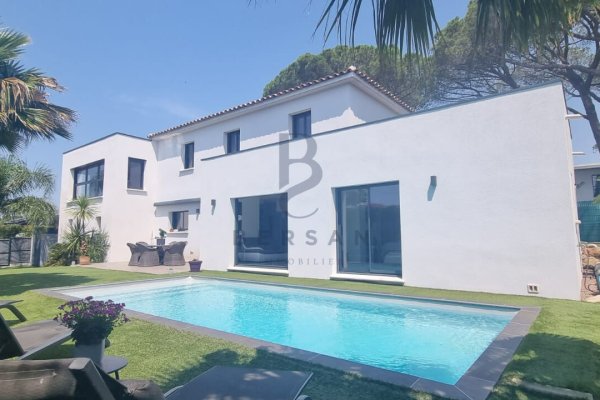 Ihre Agentur BERSAN Immobilier bietet Ihnen dieses prächtige, moderne Haus aus dem Jahr 2017 mit erstklassigen Dienstleistungen, nicht zu übersehen und in absoluter Ruhe. Es besteht aus einem Flur mit Abstellraum, einem Wohnzimmer mit Esszimmer von mehr als 50m², einer hervorragend ausgestatteten amerikanischen Küche, einer Master-Suite mit Duschbad und Ankleidezimmer, alle nach außen offen mit vielen Entspannungsbereichen mit beheiztem Pool, Whirlpool, Petanque-Platz, alles nicht übersehen und in absoluter Ruhe. Im Obergeschoss verfügt die Villa über 3 Schlafzimmer, von denen eines über ein eigenes Duschbad, ein zweites Duschbad und separate Toiletten verfügt. Sie haben auch ein klimatisiertes Spielzimmer von 30 m². Was das Parken betrifft, so verfügt die Villa über eine geschlossene Garage und Parkplätze. Was die Dienstleistungen betrifft, so ist die Villa des Labels "RT 2012" mit einer Klimaanlage, einem Zentralstaubsauger, einem thermodynamischen Tank, einem Wasserdesinfektionsmittel, grünem Wasser, Glasfasern, Taschenfenstern, Zentralverriegelung usw. ausgestattet. Zögern Sie nicht, uns für weitere Informationen zu kontaktieren oder einfach nur zu besuchen. Ein virtueller "Live"-Rundgang ist nach Vereinbarung möglich.
