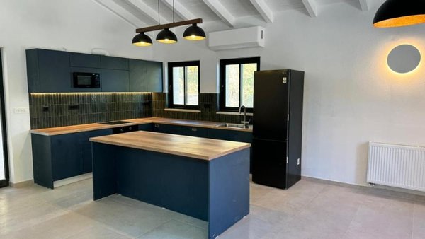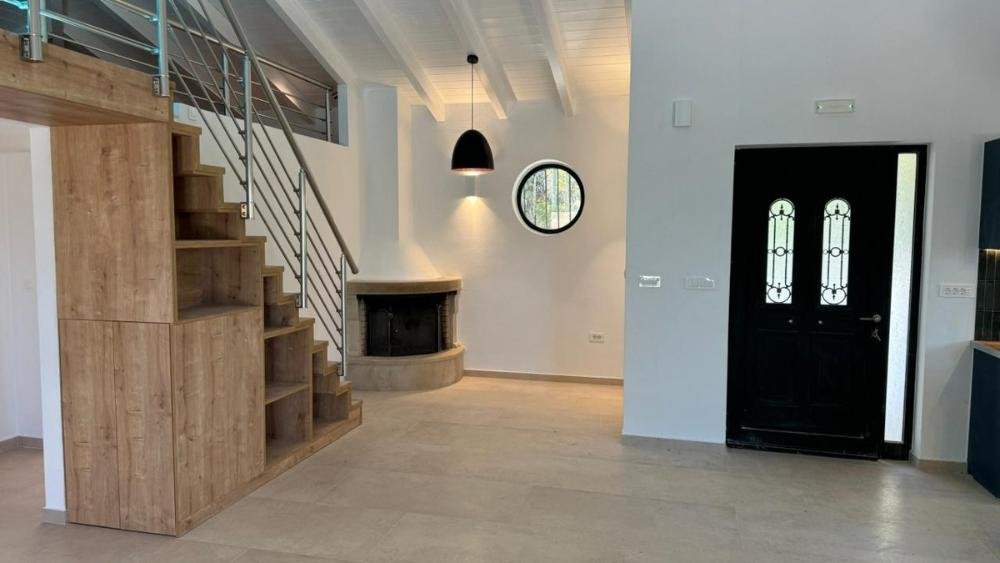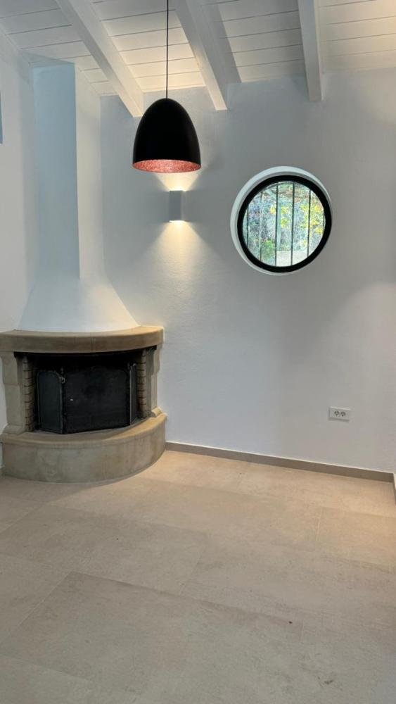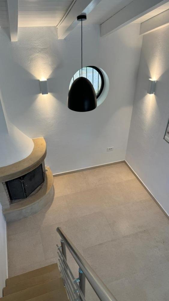 Das Haupthaus besticht durch einen offenen Wohn-, Ess- und Küchenbereich mit hohen, gewölbten Decken aus weißem Holz. Eine Galerie mit Blick auf den Wohnbereich kann als zusätzliches Schlafzimmer oder kleines Büro genutzt werden. Große Balkontüren führen auf eine Terrasse mit Pergola, und ein Steinkamin sorgt an kühleren Tagen für Gemütlichkeit. Die moderne, voll ausgestattete Küche bietet viel Stauraum. Zwei Doppelzimmer mit Einbauschränken und Klimaanlage sowie ein angrenzendes, renoviertes Badezimmer befinden sich ebenfalls im Haus.