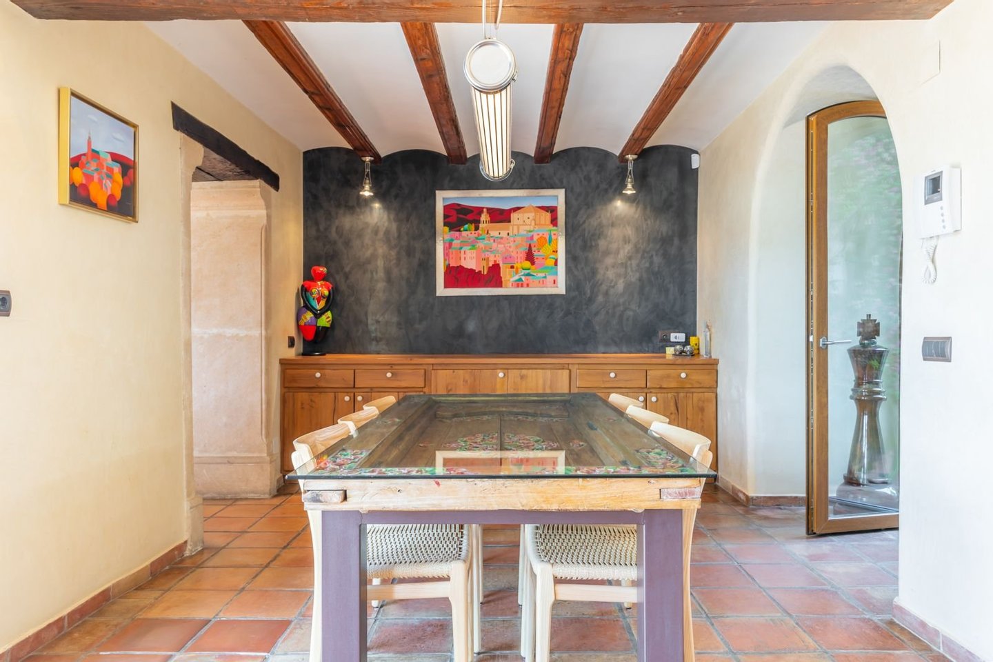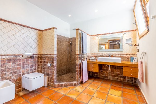 Das Haupthaus bietet 4 großzügige Schlafzimmer, 3 en-suite Badezimmer und ein Gäste-WC, funktional verteilt und mit viel Liebe zum Detail gestaltet. Edle Materialien wie Holzbalken, Terrakottaböden, der für die Region typische Piedra Tosca-Naturstein und Fußbodenheizung verleihen jedem Raum Wärme, Eleganz und mediterranen Charakter.