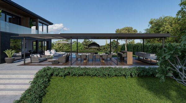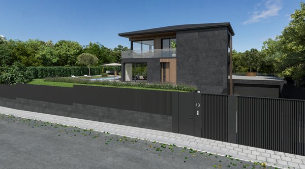 Der Komplex wird durch eine Garage für mehrere Fahrzeuge und Außenbereiche ergänzt, die der Entspannung und Privatsphäre dienen.