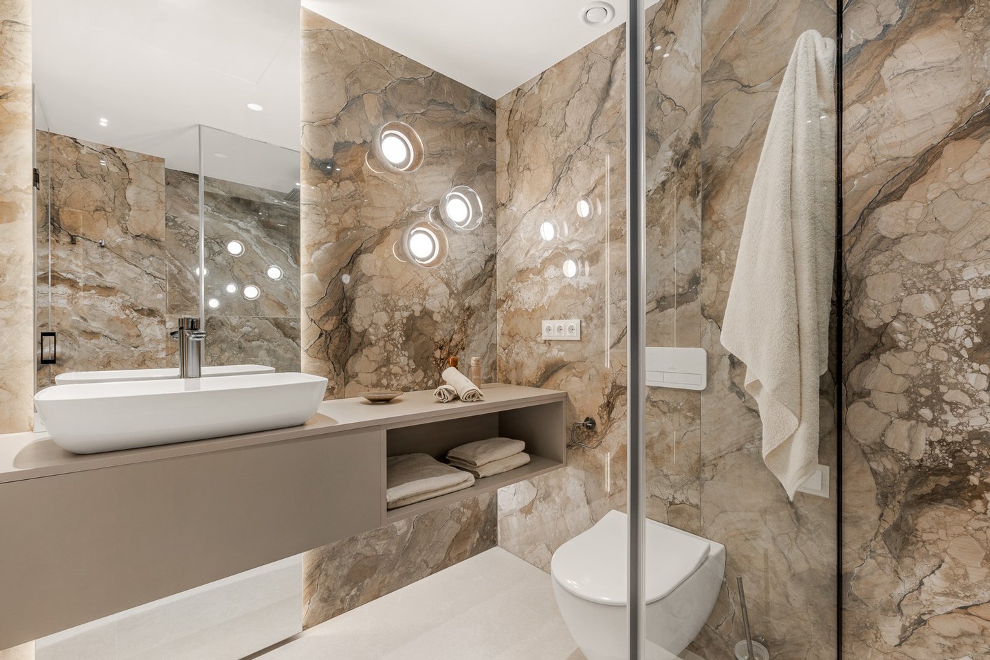 Jedes Detail wurde sorgfältig von einem erfahrenen Innenarchitekten gestaltet. Von maßgeschneiderten Einbauschränken und einer freistehenden Badewanne bis hin zum Bang & Olufsen Soundsystem, einem eleganten Elektrokamin und edlen Walk-in-Duschen – jedes Element zeugt von außergewöhnlicher Handwerkskunst und moderner Eleganz.