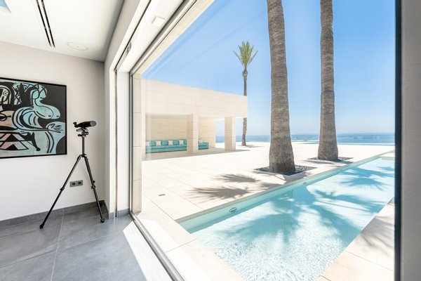 Willkommen im Paradies – diese außergewöhnliche Strandvilla ist ein wahres architektonisches Juwel, direkt an der Mittelmeerküste von Mijas Costa gelegen. Auf den ersten Blick erinnert die elegante weiße Fassade mit hohen Palmen und dem funkelnden Meer an die Hamptons, Miami oder die kalifornische Küste. Doch dieses einzigartige Anwesen thront stolz an einem der privatesten Strände der Costa del Sol, umgeben von klassischen Luxusvillen, und wird so zu einem modernen Juwel in traditioneller Umgebung.