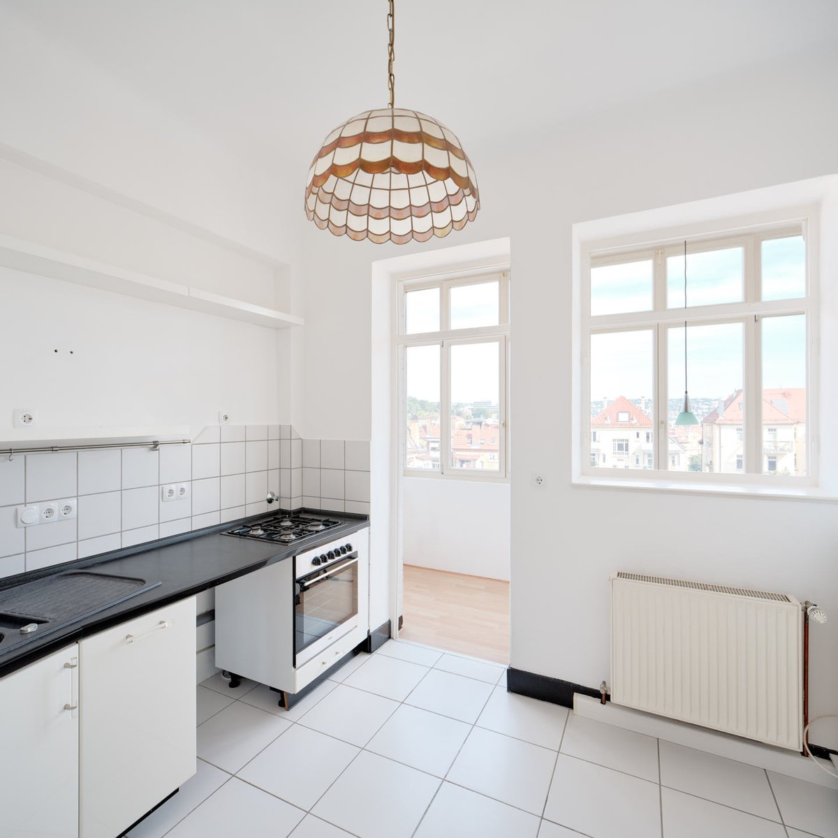 Die altbautypische und dennoch moderne Küche ist bereits enthalten - ideal für alle, die sofort einziehen möchten! Sie bietet einen nahtlosen Übergang auf den verglasten Balkon, von dem aus man die einzigartige Aussicht auf die Stadt genießen kann, und sorgt damit für eine angenehme Atmosphäre bei der Zubereitung von Speisen. Eine Gas-Etagenheizung sorgt zudem in den kalten Monaten zuverlässig für wollige Wärme.