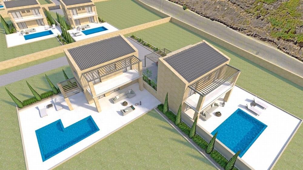 Jede Villa liegt auf einem weitläufigen, über 2.000 m² großen Privatgrundstück und bietet auf zwei Ebenen eine Wohnfläche von insgesamt 137,5 m². Die Villen wurden aus lokalem, handbehauenem weiß-beigem Stein erbaut und zeugen von der Handwerkskunst und Ästhetik authentischen kretischen Designs. Die Architektur vereint Naturstein, Holz und Glas harmonisch zu einer Atmosphäre von schlichter Eleganz und zeitloser Qualität.