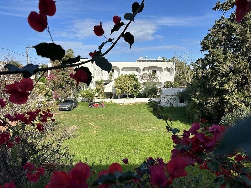 Das Gebäude befindet sich in einem guten baulichen Zustand und kann problemlos renoviert oder modernisiert werden, um den heutigen Standards der Hotellerie zu entsprechen. Ein großzügiger Innenhof mit altem Baumbestand und farbenprächtigen Bougainvilleen umgibt das Anwesen und schafft eine angenehme mediterrane Atmosphäre. Eine hölzerne Pergola spendet Schatten und dient als Snackbar – ein einladender Ort für Gäste, um sich zu entspannen und den ganzen Tag über Erfrischungen zu genießen.