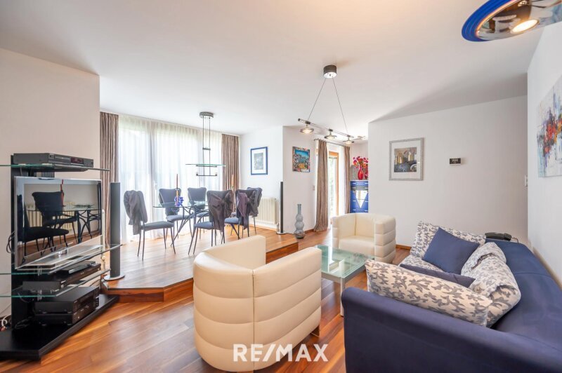 Vom Vorzimmer aus gelangt man in den großzügigen Wohn- / Esszimmer / Küchenbereich der ca. 42m² misst. Der Essbereich ist auf einem Podest vom Rest des Raumes optisch elegant abgetrennt - sowohl Küche, als auch Ess- / Wohnbereich sind durch die Südlage hell & lichtdurchflutet.