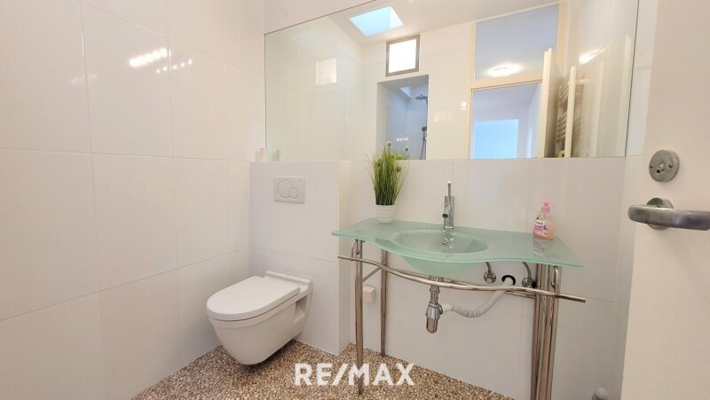Das Bad/WC hat eine Dusche, einen Waschtisch und einen Handtuchhalterheizkörper für kuschelige Handtücher und wird durch Dachfenster auch natürlich belichtet.