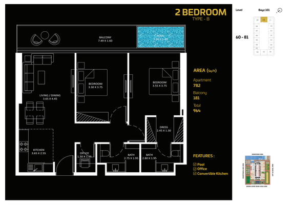 Treten Sie ein in das luxuriöse Leben im Bayz101 by Danube, wo Sie eine breite Palette von Annehmlichkeiten genießen können, die Ihren Lebensstil verbessern. Tauchen Sie in den Infinity-Pool ein, entspannen Sie sich im Spa und in der Sauna, oder