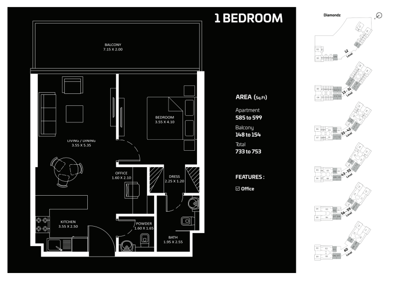 Wenn Sie dieses luxuriöse 1-Schlafzimmer-Apartment im Diamondz by Danube betreten, werden Sie von den raumhohen Fenstern mit einem atemberaubenden Blick auf die Skyline der Stadt begrüßt. Der geräumige Wohnbereich ist perfekt zum Entspannen und Unterhalten, mit Zugang zum Infinity-Pool auf dem Dach, wo Sie sich entspannen und den Panoramablick genießen können.
