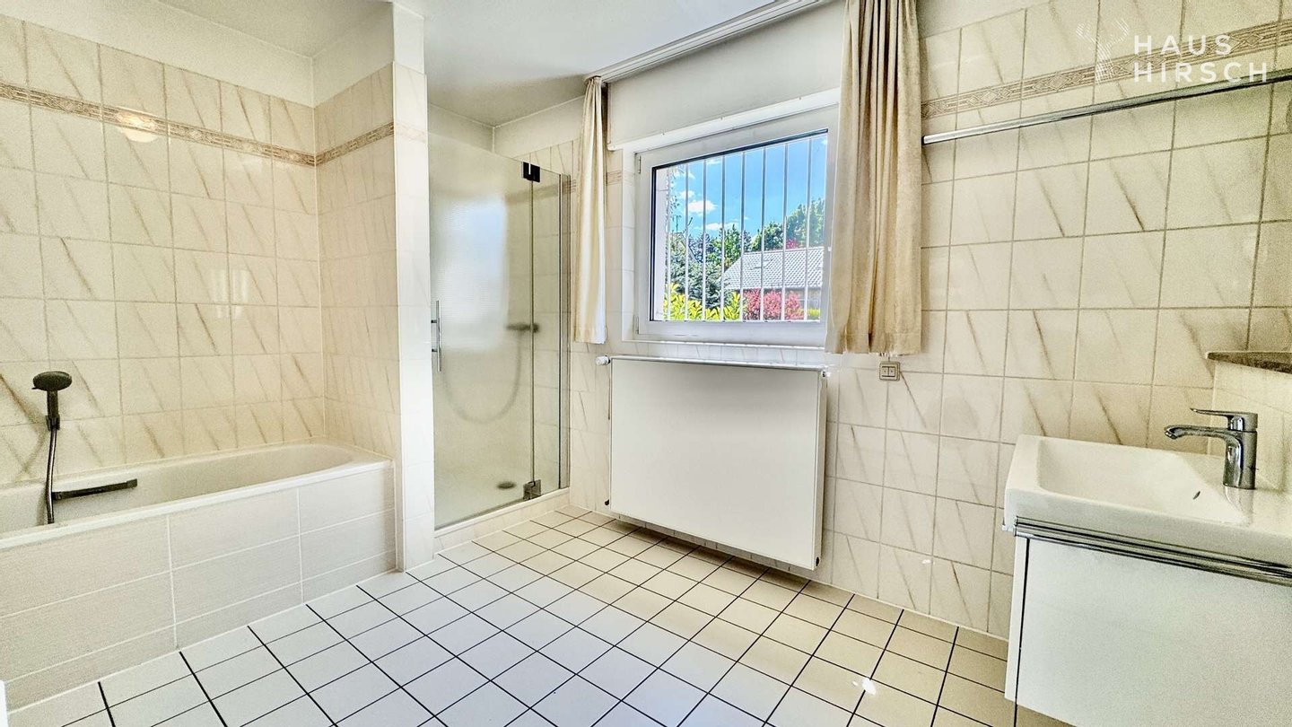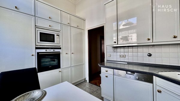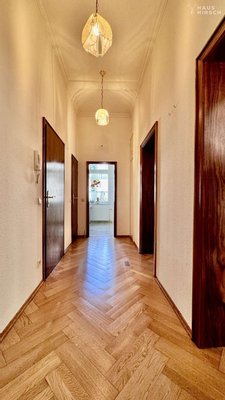 Im Erdgeschoss erwartet Sie ein großzügiger Wohnbereich, der klassische Eleganz mit funktionalem Komfort verbindet. Die Küche, das Wohnzimmer und das angrenzende Esszimmer sind durch eine stilvolle Schiebetür mit Glaselementen verbunden – so entsteht ein offenes, aber dennoch strukturierbares Raumgefühl. Der beheizte Wintergarten ist nicht nur ein lichtdurchfluteter Rückzugsort, sondern bietet auch direkten Zugang zum liebevoll angelegten Garten. Darüber hinaus verfügt das Erdgeschoss über ein Schlafzimmer, ein Tageslichtbad sowie ein separates Gäste-WC. Besonders hervorzuheben ist die beeindruckende Deckenhöhe von ca. 3,30 m. Aufwendig gearbeitete Stuckleisten und ein hochwertiges Echtholzparkett im klassischen Fischgrätenmuster unterstreichen den stilvollen Charakter dieses Geschosses.