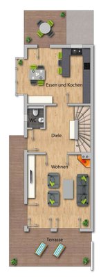 Im Erdgeschoss heißt Sie ein großzügiger Eingangsbereich willkommen, der den Blick in die Wohnküche und das rechts gelegene Wohnzimmer freigibt. Der helle, freundliche Wohn- und Essbereich mit Kamin öffnet sich zur sonnigen Südterrasse und überzeugt durch große Fensterflächen, die viel Licht und Weite schaffen. Die gepflegte Wohnküche ist mit einer funktionalen Einbauküche, Granitarbeitsplatte und allen Geräten des täglichen Bedarfs ausgestattet. Von hier aus haben Sie zudem einen direkten Zugang in den Garten auf der Nordseite – ein schöner Ort für ruhige schattige Momente im Freien.