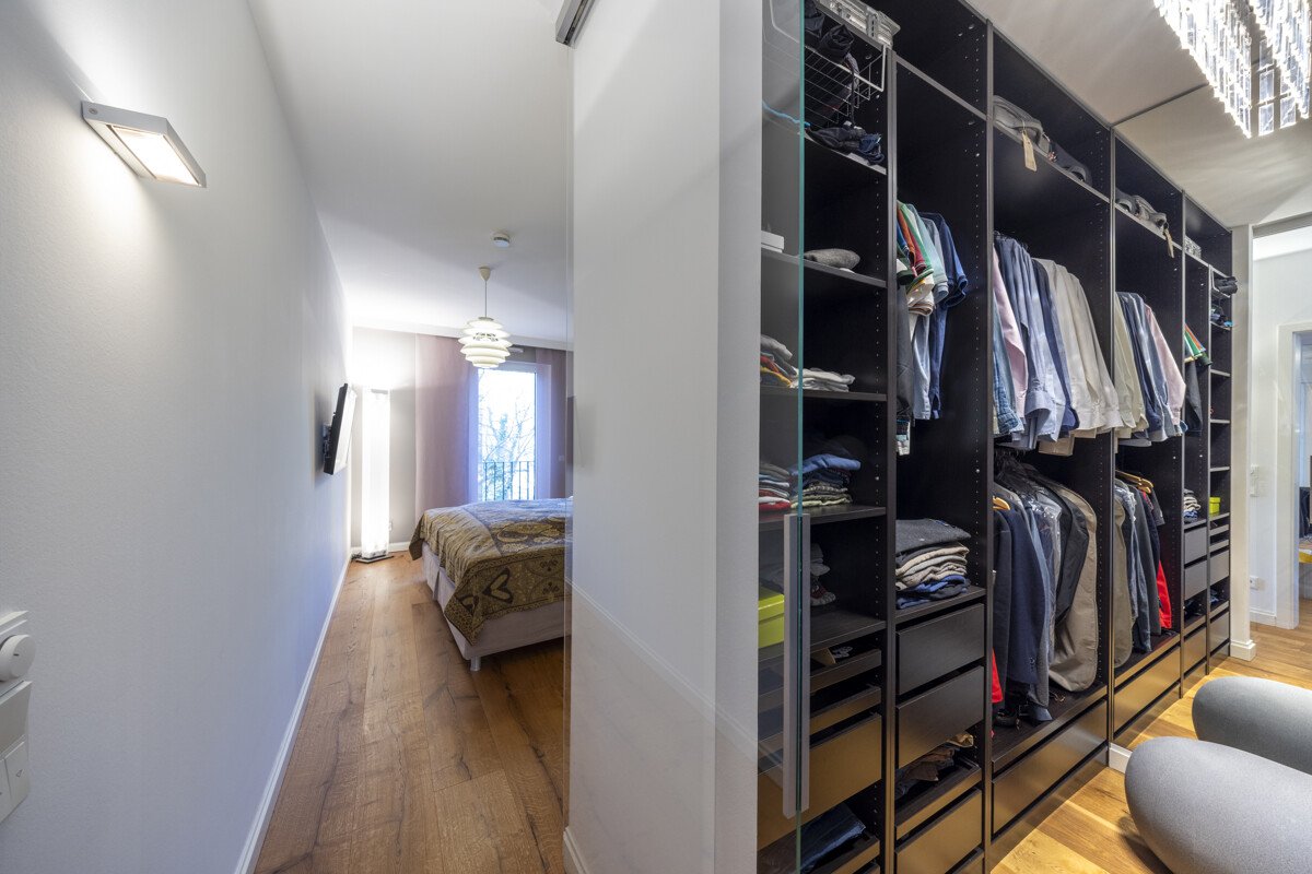 Direkt an den Wohn-Essbereich schließt sich der Mastertrakt an, der als privater Rückzugsbereich konzipiert ist. Im Zentrum dieses Traktes befindet sich eine großzügige, begehbare Ankleide mit maßgefertigter Spiegelwand und eleganter Glastür. An ihr vorbei gelangt man in das exklusive Masterbad, das mit zwei individuell angefertigten Waschtischen, einer geräumigen, ebenerdigen Dusche, einem separaten WC, Marazzi-Fliesen sowie Dornbracht-Armaturen und Villeroy-&-Boch-Keramik höchsten Komfort bietet.