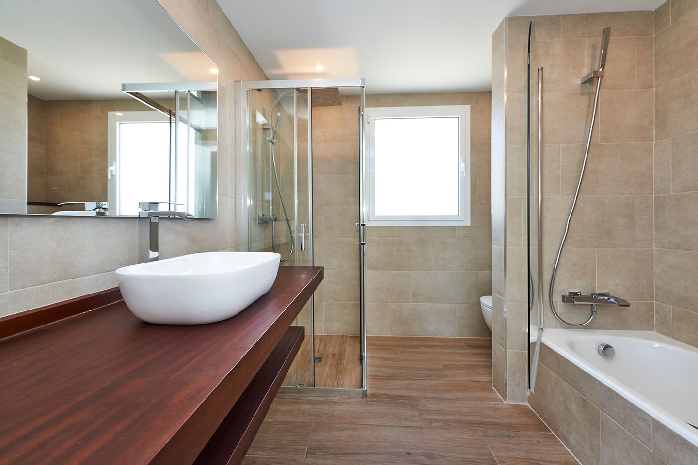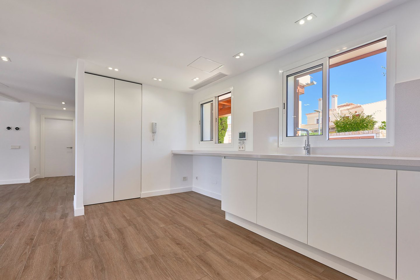 Die lichtdurchflutete Immobilie überzeugt durch ihre moderne, stilvolle Ausstattung und eine sehr funktionale Raumaufteilung, die eine optimale Nutzung aller Bereiche ermöglicht. Neben zentralen, in allen Räumen integrierten Klimageräten (warm/kalt) verfügt das Haus über einen Kamin im Wohnbereich, der zusätzlichen Komfort bietet. Alle drei Schlafzimmer sind mit großzügigen Einbauschränken ausgestattet und bieten ausreichend Stauraum.