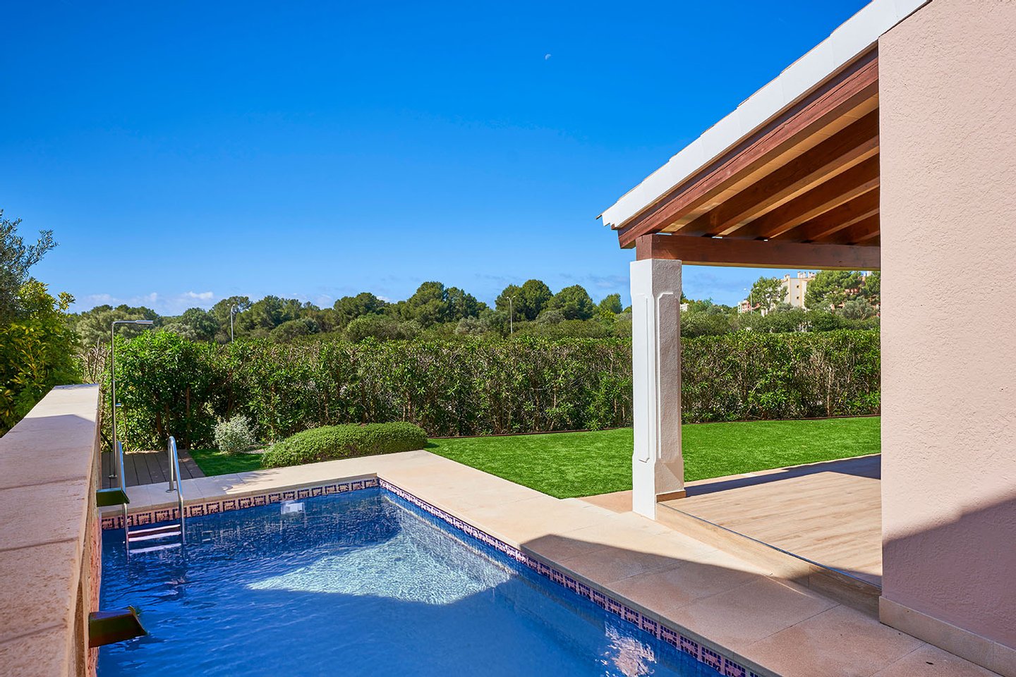 Der einladende Außenbereich umfasst einen pflegeleicht gestalteten Garten mit privatem Swimmingpool sowie offene und überdachte Terrassen, die einen schönen Panoramablick über den angrenzenden Golfplatz bieten. Zwei PKW-Stellplätze komplettieren dieses attraktive Angebot.
