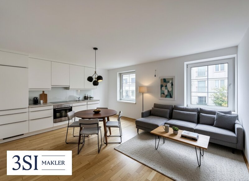 Der offene Wohn-/Essbereich mit integrierter Küche ist das Herzstück der Wohnung. Hier treffen Kochen, Genießen und Entspannen aufeinander und schaffen einen Raum, in dem Sie sich sofort zuhause fühlen.