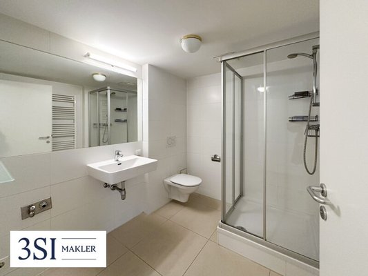 Das Badezimmer begeistert mit klarer Eleganz, eine moderne Dusche, WC und der Waschmaschinenanschluss machen es nicht nur funktional, sondern auch zu einem Ort, an dem Sie frisch in den Tag starten oder den Abend entspannt ausklingen lassen.