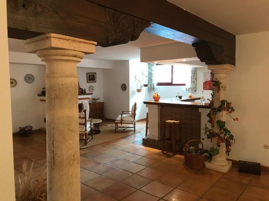 Untergeschoss: Geräumiger Flur, Spielzimmer, Essbereich mit Bar, Küche, Weinkeller mit Kamin, Abstellraum, WC, Hauswirtschaftsraum und ein zusätzlicher großer Aufenthaltsraum. Alle Zimmer haben Fenster.