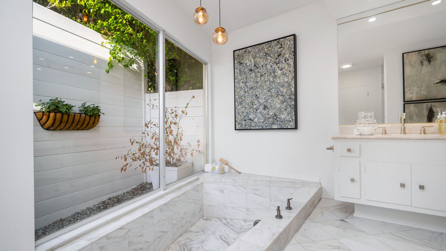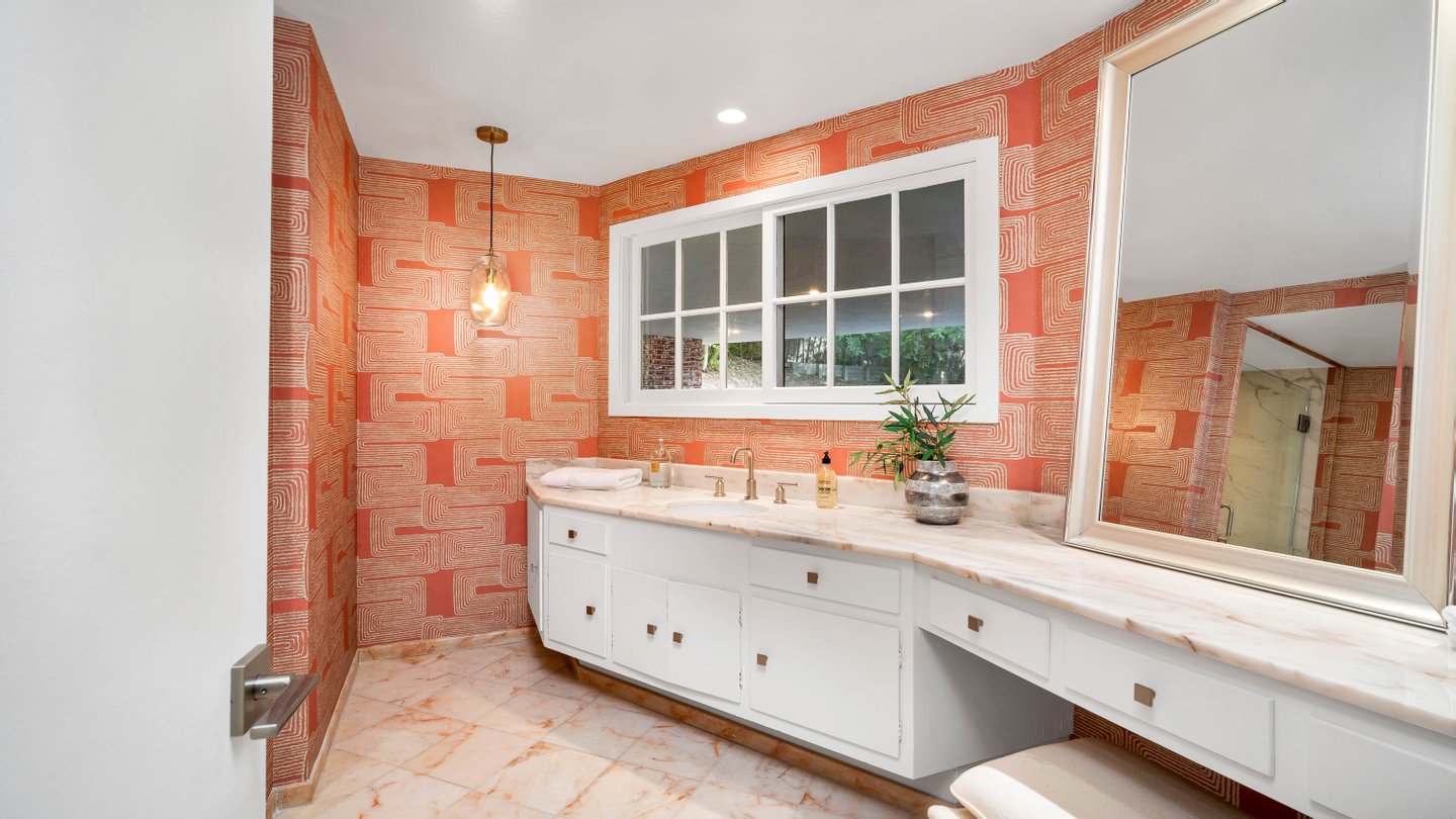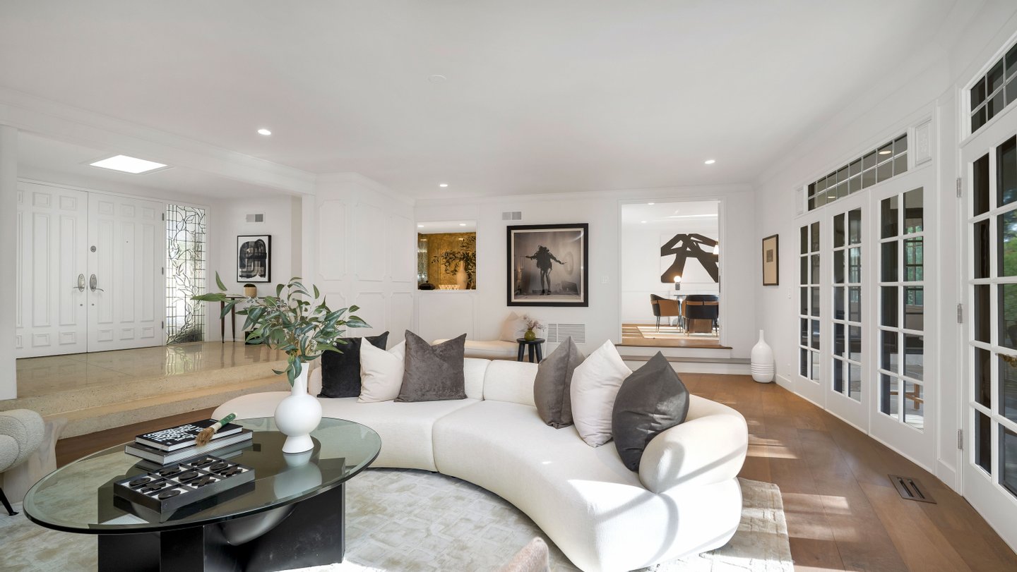 Eingebettet in eine der begehrtesten Enklaven der Angelo Drive verbindet dieses meisterhaft renovierte Mid-Century-Wohnhaus klassische Architektur der 1960er Jahre mit modernen modernen Modernisierungen, die sorgfältig integriert sind, um den Mid-Century-Charakter des Hauses zu bewahren. An einer abgelegenen Straße gelegen, nur wenige Augenblicke oberhalb des Sunset Blvd, bietet das Anwesen unvergleichliche Privatsphäre und ruhige Ausblicke auf die Baumwipfel. Wunderschön neu gestaltet, umfasst der etwa 3.400 Fuß große Grundriss 4 Schlafzimmer und 4 verfeinerte Bäder, mit großen, sonnengefüllten Wohnräumen, eingerahmt von restaurierten französischen Türen und übergroßen Fenstern. Ein tiefer, umlaufender Balkon verbindet Wohnzimmer, Esszimmer und Hauptsuite und schafft so einen nahtlosen Fluss zwischen drinnen und draußen. Die sonnengewaschene Küche des Kochs verfügt über eine großzügige Insel mit Steindecke, hochwertige Edelstahlgeräte, maßgefertigte Schränke und eine sonnenbeschienene Frühstücksnische. Die Hauptsuite öffnet sich direkt zur Terrasse und bietet einen ruhigen Gartenblick sowie ein spa-inspiriertes Bad mit dramatischen Steinfinishen, eine große begehbare Dusche und eine tiefe, absteigende Badewanne. Kuratierte Verbesserungen umfassen neue Böden, renovierte Badezimmer, Designerbeleuchtung, aufgefrischte Oberflächen und verbesserte Systeme. Das Gelände umfasst eine ausgewachsene Landschaftsanlage, eine großzügige Terrasse zum Essen und Entspannen sowie einen breiten Motorplatz mit überdachten Parkplätzen. Ein elegantes, zentrales Rückzugsort aus der Mitte des Jahrhunderts in einem der diskretesten Bereiche von BHPO – mit Privatsphäre, architektonischem Charme und mühelosem Zugang zu Beverly Hills, Holmby Hills und der erstklassigen Warner Avenue Elementary.