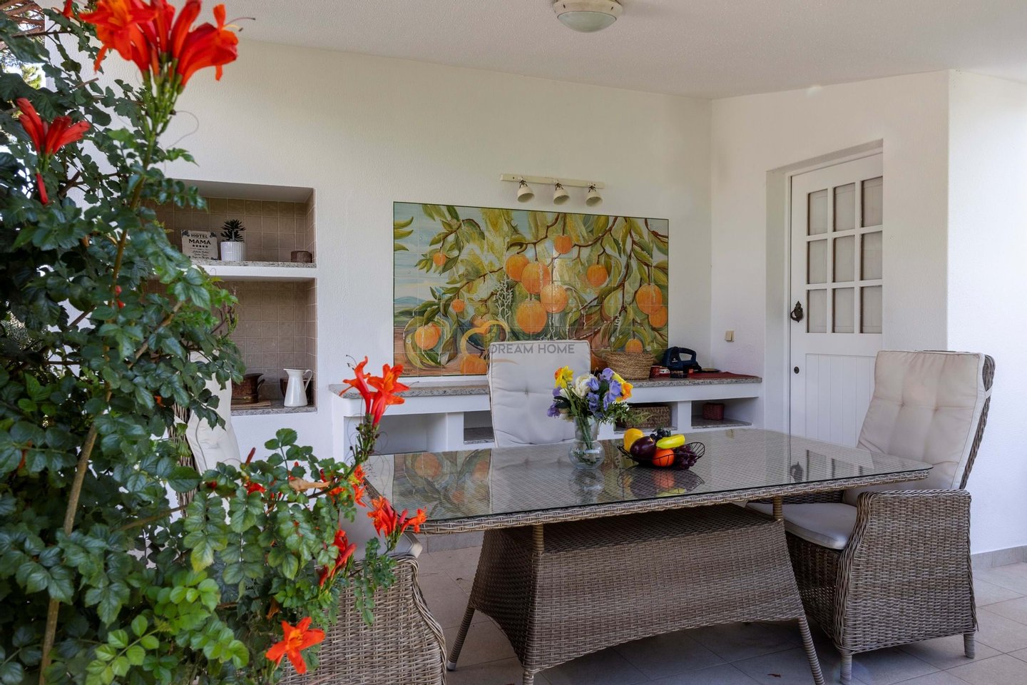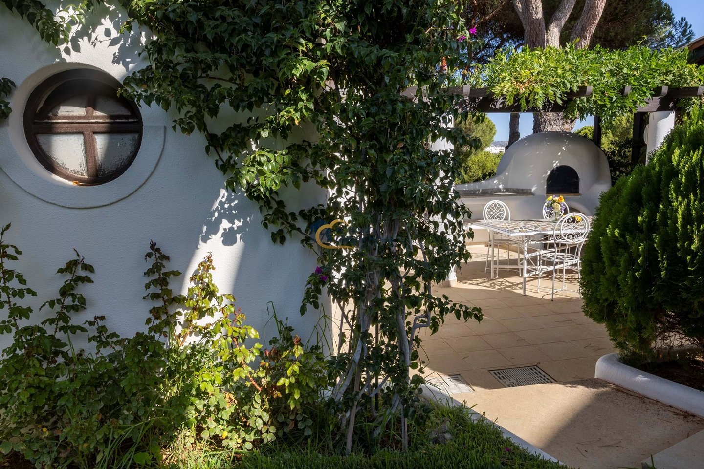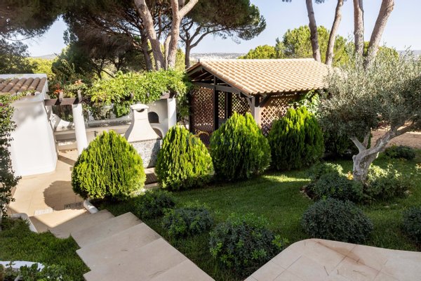 Draußen ist die Atmosphäre ruhig und einladend. Garten mit Obstbäumen, Grillplatz und Zwinger für die Aufbewahrung des Gärtners, große Balkone und ein Swimmingpool, der mit dem umliegenden Grün verschmilzt.