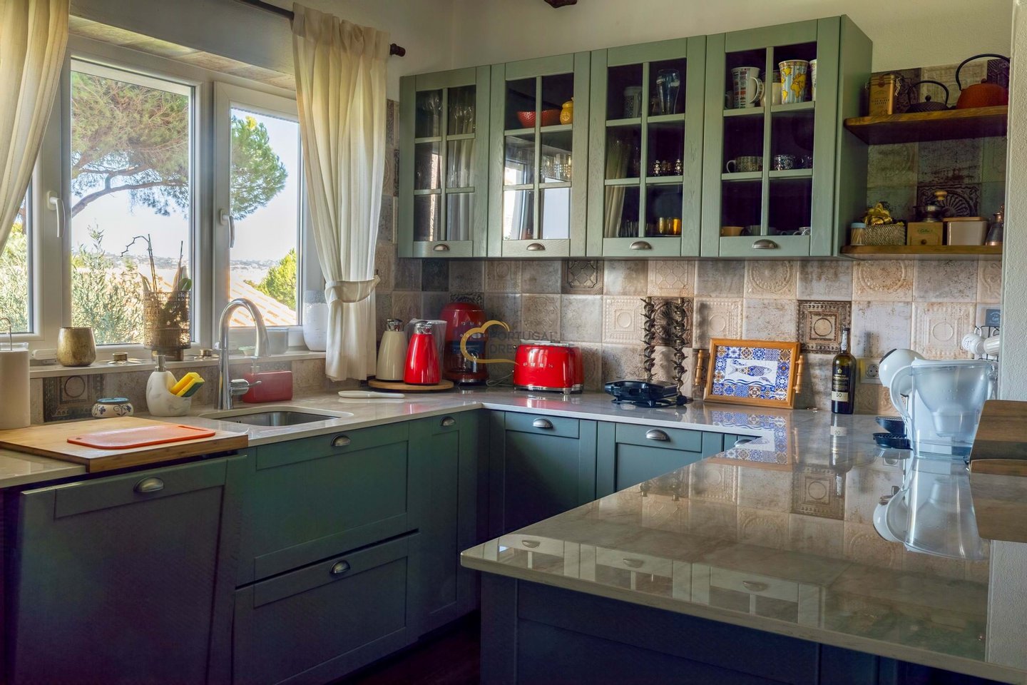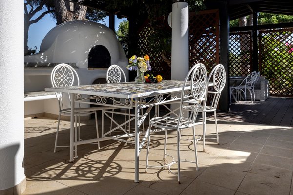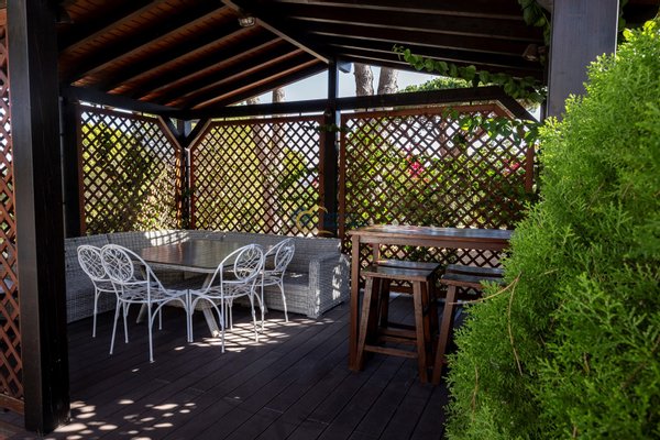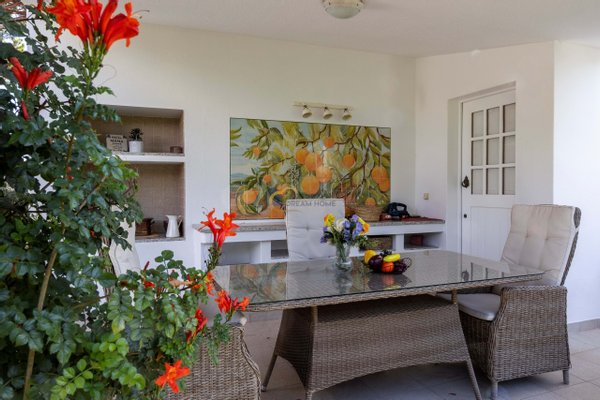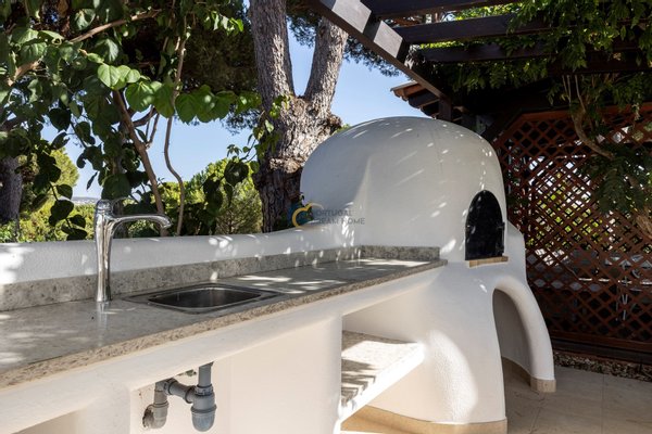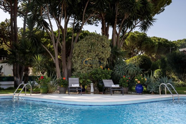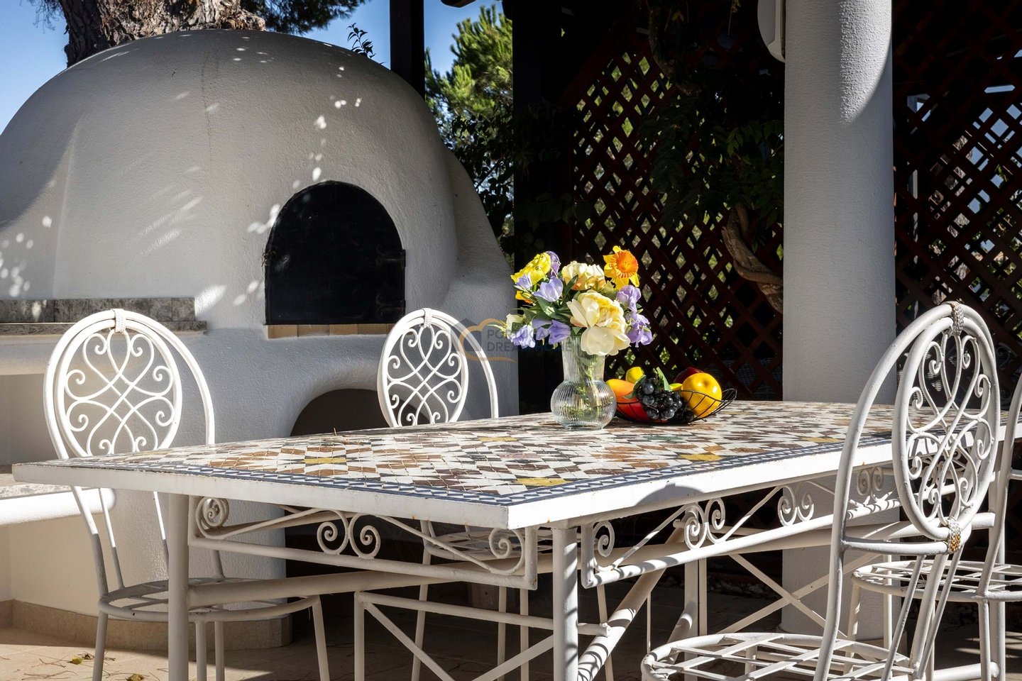 Draußen ist die Atmosphäre ruhig und einladend. Garten mit Obstbäumen, Grillplatz und Zwinger für die Aufbewahrung des Gärtners, große Balkone und ein Swimmingpool, der mit dem umliegenden Grün verschmilzt.