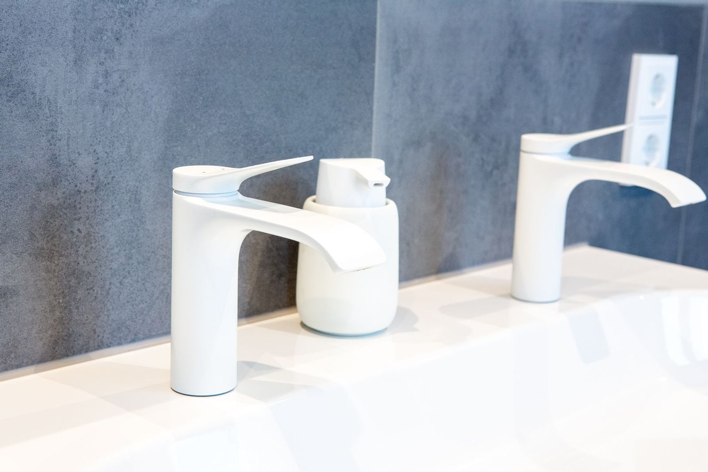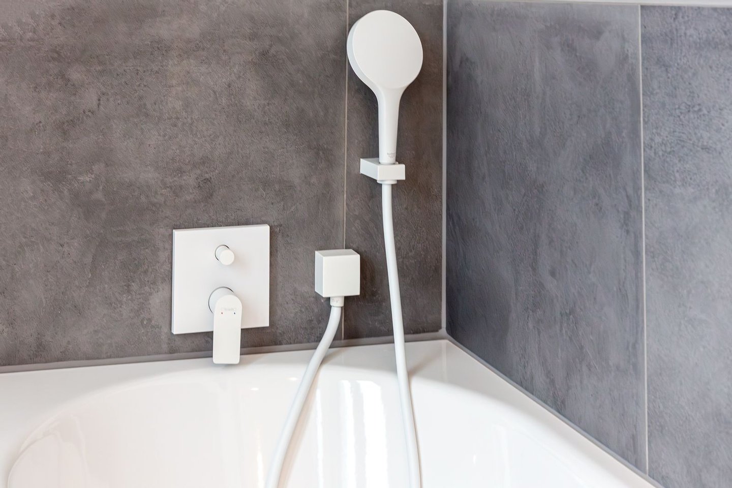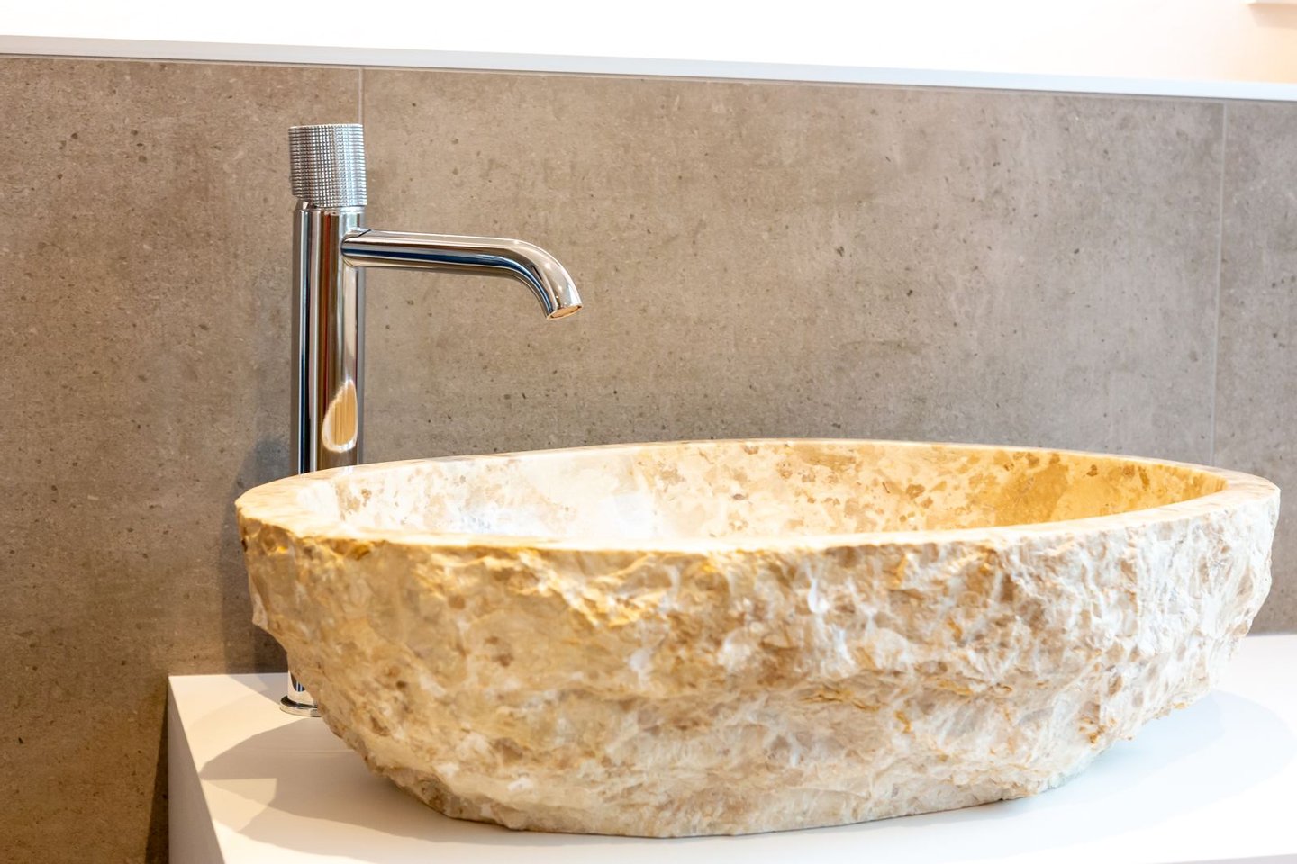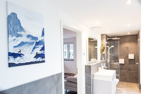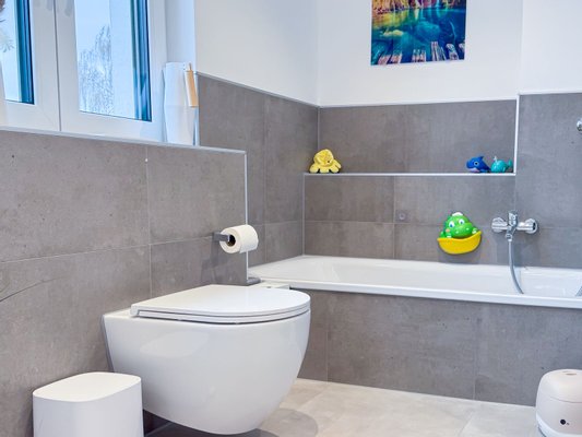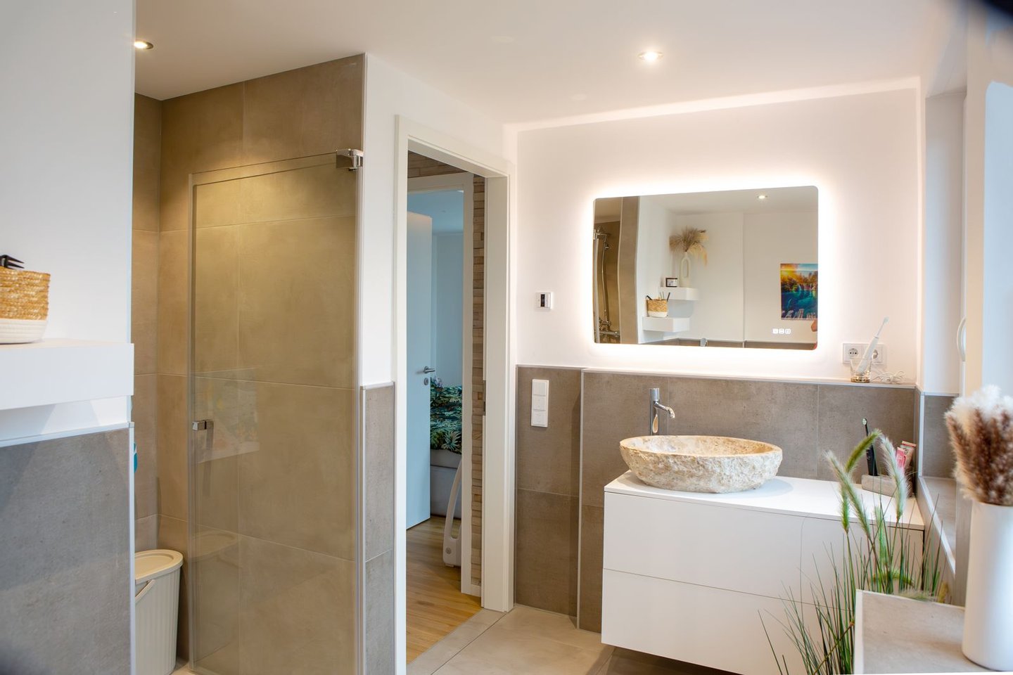 •Maßgefertigte Schreinerarbeiten bei den Waschbecken im Gäste-WC und im Badezimmer, zwei Badewannen und eine Regendusche