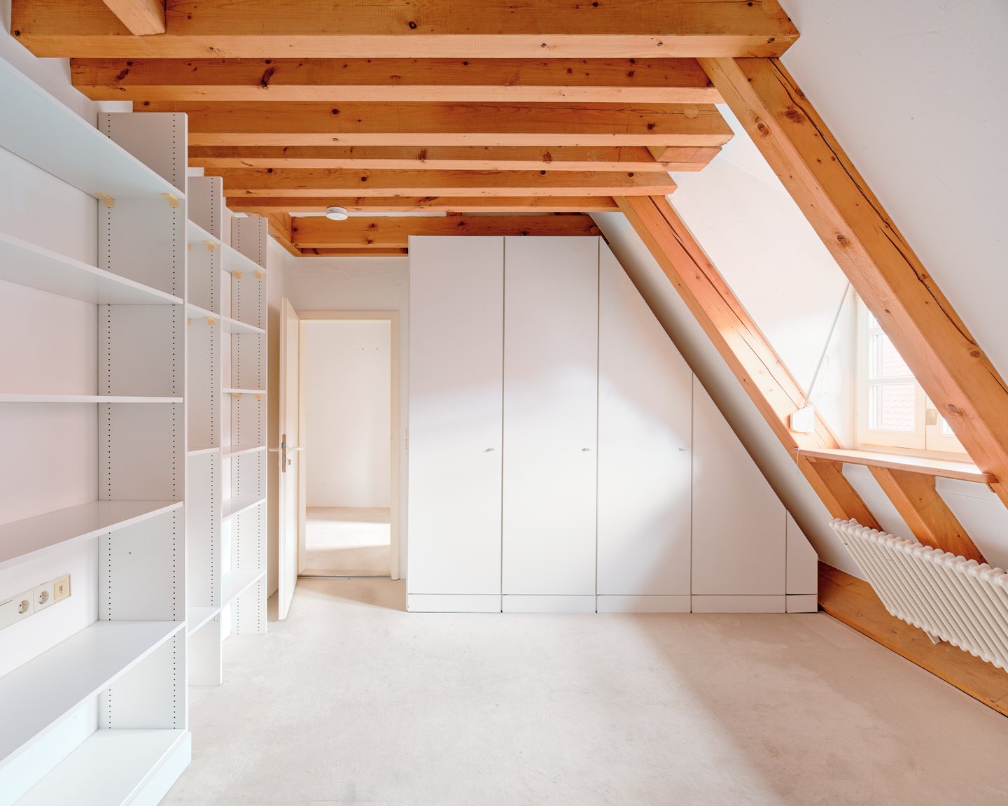 Über die innenliegende Treppe gelangen Sie in das obere Geschoss, das als privater Rückzugsbereich der Wohnung dient. Zwei Schlafzimmer bieten hier viel Ruhe und Privatsphäre. Das größere Schlafzimmer überzeugt mit einem warmen, behaglichen Ambiente und bietet ausreichend Platz für einen Kleiderschrank sowie eine kleine Leseecke. Das zweite Zimmer eignet sich hervorragend als Kinder-, Arbeits- oder Gästezimmer – je nach individuellem Bedarf.