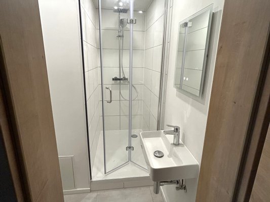 Das Badezimmer ist mit einer Dusche ausgestattet. Eine Bushaltestelle befindet sich unmittelbar vor dem Haus. Die Wohnung wird durch energiesparende Elektromarmorheizungen beheizt.