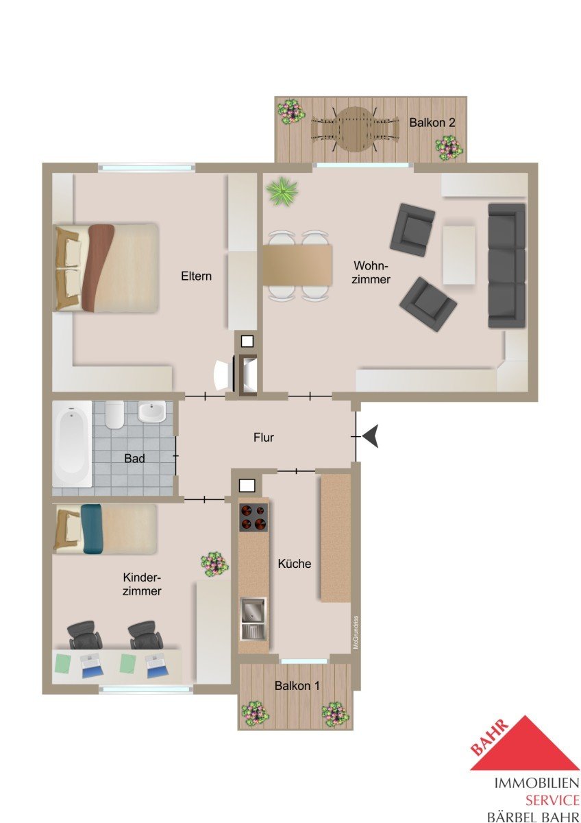 Der Wohnbereich mit Zugang zu einem der beiden Balkone schafft eine angenehme Wohnatmosphäre. Eine separate Küche mit zusätzlichem Balkon bietet ausreichend Platz für alle Kochbedürfnisse. Zwei gut geschnittene Schlafzimmer ermöglichen flexible Nutzung – ob als Kinderzimmer, Büro oder Gästezimmer.