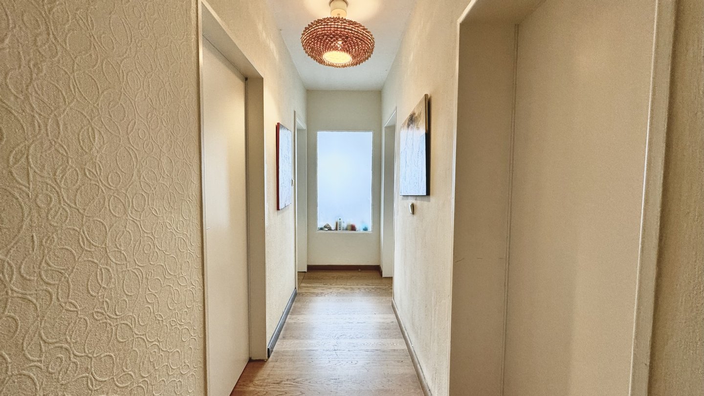 Über die zentrale Treppe gelangen Sie in das Obergeschoss, in dem sich die Schlafzimmer befinden. Zwei der ursprünglich drei Kinderzimmer wurden zu einem großen Raum zusammengelegt – ideal als geräumiges Kinderzimmer, Jugendzimmer oder Hobbyraum. Sowohl das Elternschlafzimmer als auch das zusammengelegte Kinderzimmer verfügen über einen Zugang zum Balkon. Ein modernes, helles Tageslichtbad mit Eckbadewanne rundet das Raumangebot auf dieser Etage ab.