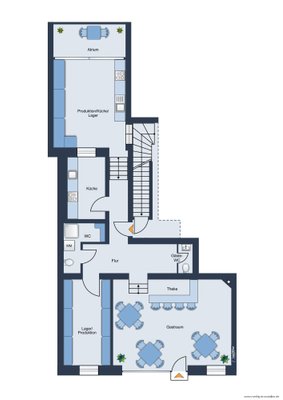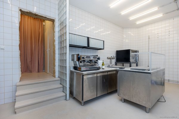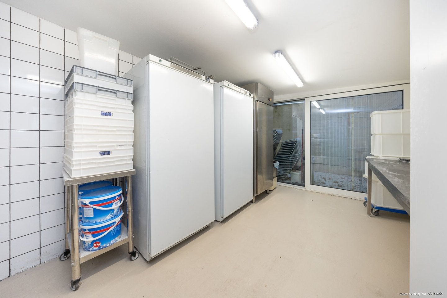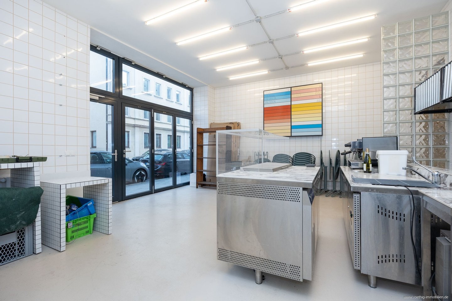 Im hinteren Bereich der Gewerbefläche stehen Ihnen weitere Räume zur Verfügung. Dazu gehören die Küche, ein Gäste-WC, ein Lagerraum, ein Mitarbeiterbad sowie ein weiterer, vielseitig nutzbarer Raum im Souterrain.