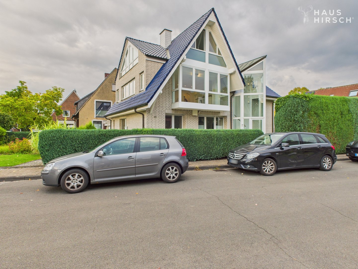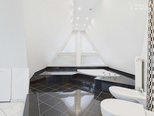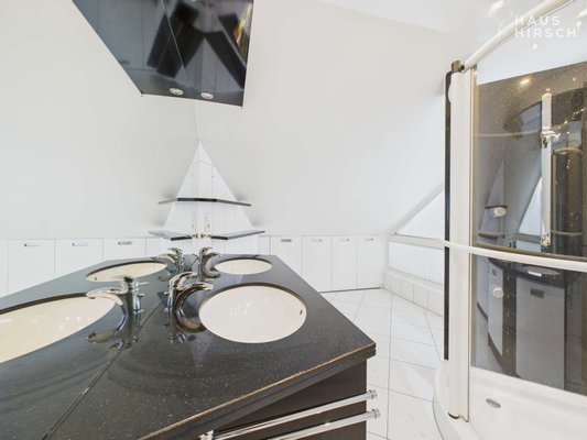 Die zweite Wohneinheit im Ober- und Dachgeschoss erreicht man über ein seitlich angebautes, stilvolles Glastreppenhaus. Auf rund 179 m² überzeugt diese Etage durch Großzügigkeit und Eleganz: Ein riesiges Wohnzimmer mit Kamin schafft eine gemütliche Atmosphäre, während die exklusive Designerküche mit Granitplatten und Kochinsel (Wert ca. 70.000 €, im Kaufpreis enthalten) das Herzstück der Einheit bildet. Helle, offene Grundrisse und luxuriöse Bäder mit exklusiver Ausstattung runden das Wohnerlebnis ab.