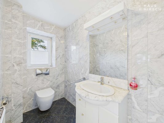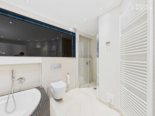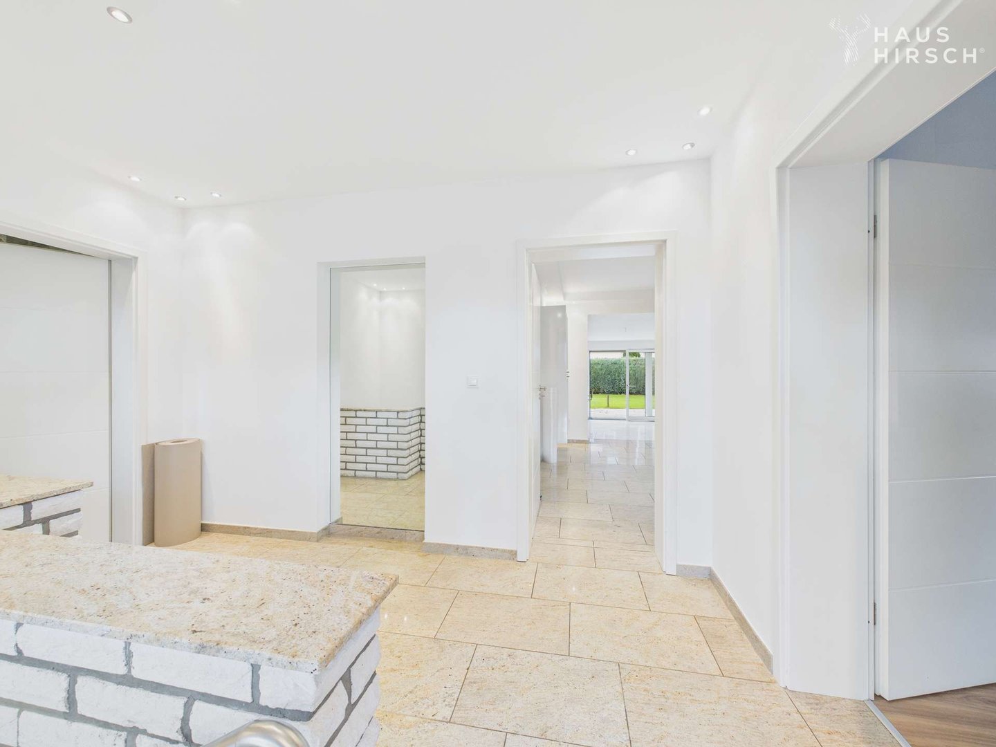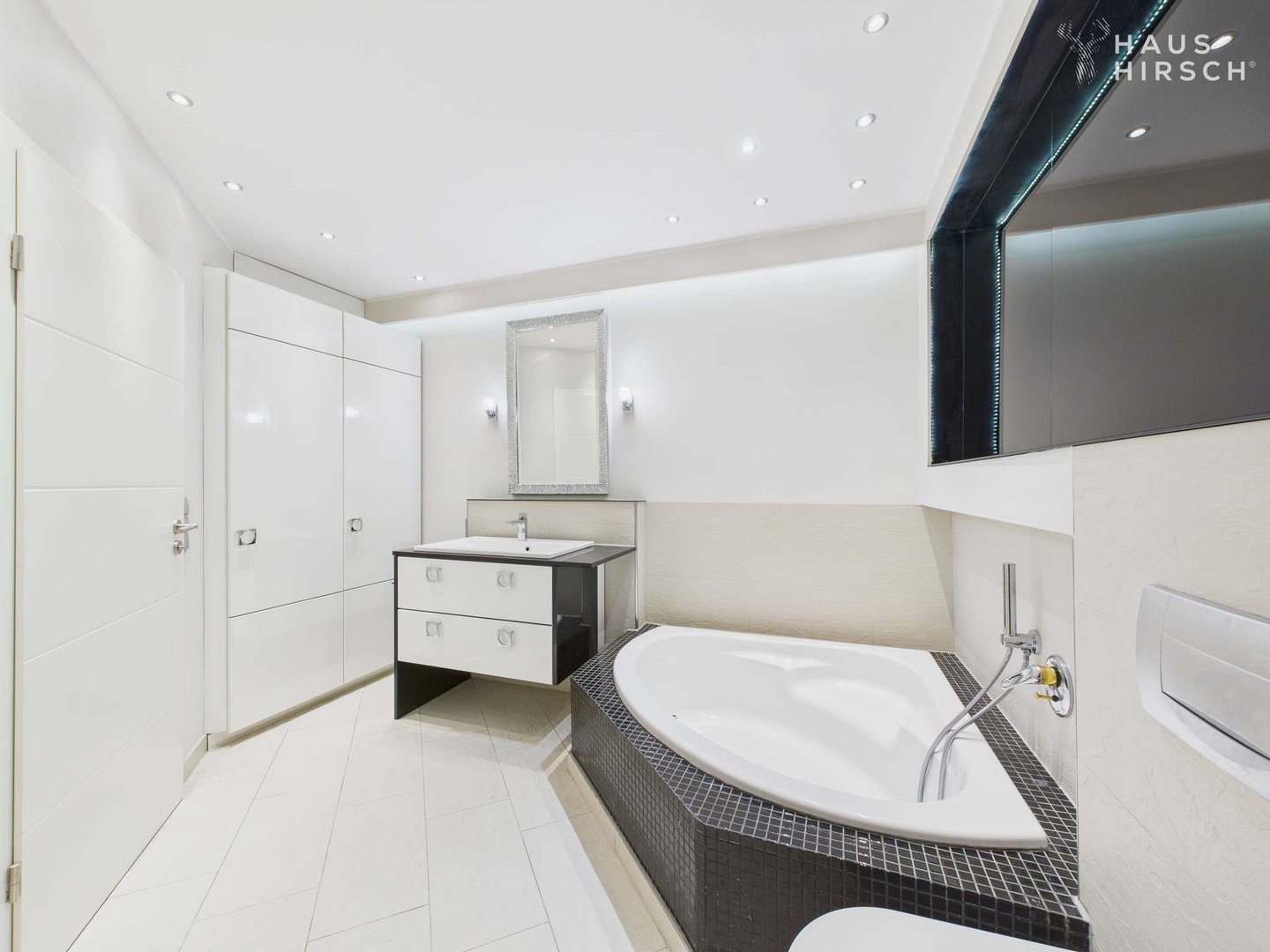 Das Erdgeschoss mit direktem Zugang zum Souterrain bietet auf rund 137 m² ein offenes, lichtdurchflutetes Wohnkonzept. Großzügige Fensterflächen eröffnen den Blick in den weitläufigen Garten, während die edle Designerküche mit hochwertiger Kochinsel (Neuwert ca. 35.000 €, im Kaufpreis enthalten) und Natursteinböden aus Granit Eleganz und Exklusivität ausstrahlen. Für höchsten Wohnkomfort sorgen eine moderne Klimatisierung, ein großzügiges Schlafzimmer sowie ein luxuriös ausgestattetes Bad mit Badewanne, ebenerdiger Dusche und Doppelwaschtisch. Das Souterrain eignet sich ideal als Hobbyraum, Büro oder Gästezimmer.